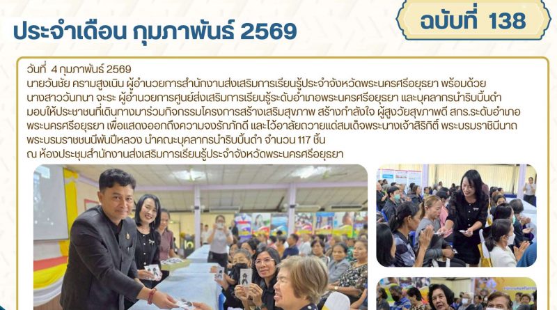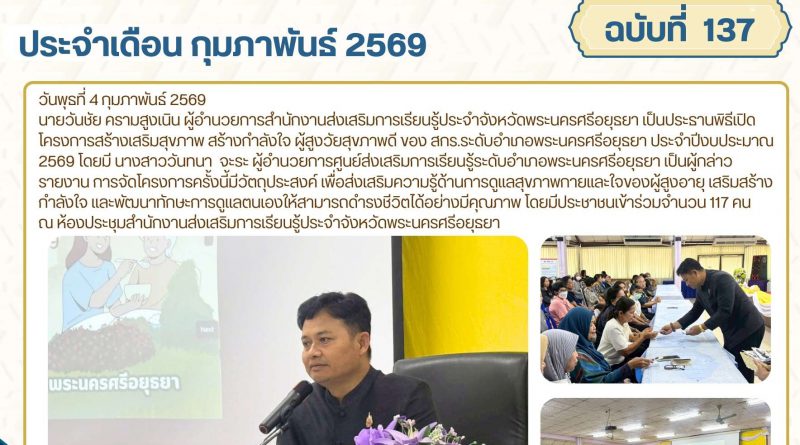 จดหมายข่าว admin 4 กุมภาพันธ์ 20269 กุมภาพันธ์ 2026 เป็นประธานพิธีเปิดโครงการสร้างเสริมสุขภาพ สร้างกำลังใจ ผู้สูงวัยสุขภาพดี ของ สกร.ระดับอำเภอพระนครศรีอยุธยา ประจำปีงบประมาณ 2569 วันพุธที่ 4 กุมภาพัน Read More
