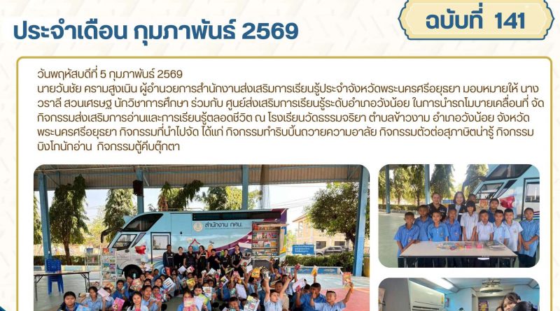 จดหมายข่าว admin 5 กุมภาพันธ์ 20269 กุมภาพันธ์ 2026 นำรถโมบายเคลื่อนที่ จัดกิจกรรมส่งเสริมการอ่านและการเรียนรู้ตลอดชีวิต วันพฤหัสบดีที่ 5 กุม Read More