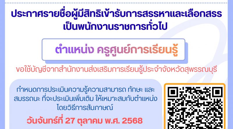 ประกาศ admin 16 ตุลาคม 202516 ตุลาคม 2025 ประกาศรายชื่อผู้มีสิทธิเข้ารับการสรรหาและเลือกสรร เป็นพนักงานราชการทั่วไป ตำแหน่ง ครูศูนย์การเรียนรู้ ประกาศรายชื่อผู้มีสิ Read More