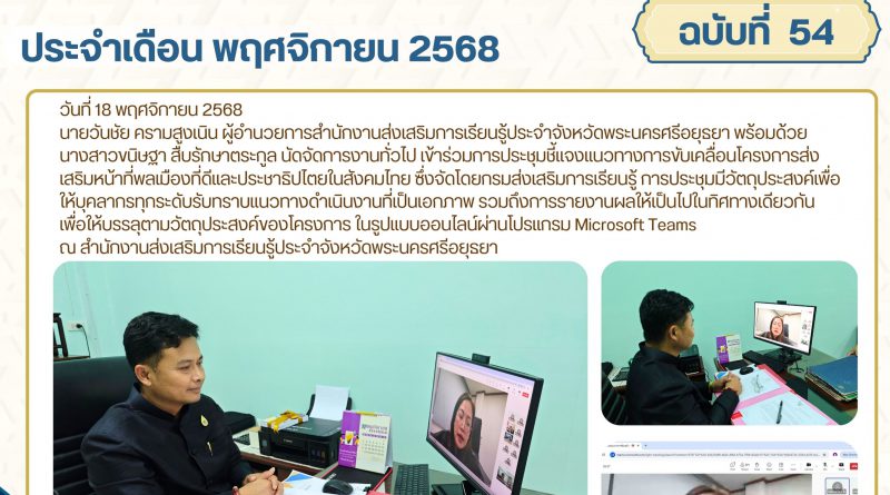 จดหมายข่าว admin 18 พฤศจิกายน 202520 พฤศจิกายน 2025 เข้าร่วมการประชุมชี้แจงแนวทางการขับเคลื่อนโครงการส่งเสริมหน้าที่พลเมืองที่ดีและประชาธิปไตยในสังคมไทย ซึ่งจัดโดยกรมส่งเสริมการเรียนรู้ วันที่ 18 พฤศจิกายน Read More