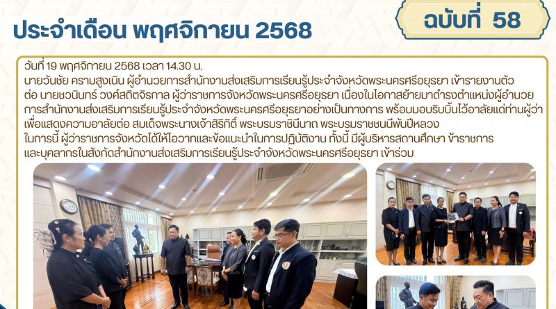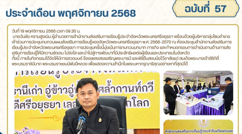 จดหมายข่าว admin 19 พฤศจิกายน 202520 พฤศจิกายน 2025 เข้าร่วมการประชุมทบทวนแผนส่งเสริมการเรียนรู้ของจังหวัดพระนครศรีอยุธยา พ.ศ.2568–2570 วันที่ 19 พฤศจิกายน Read More