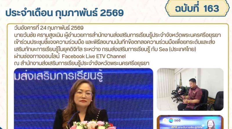 จดหมายข่าว admin 24 กุมภาพันธ์ 20262 เมษายน 2026 เข้าร่วมประชุมชี้แจงความร่วมมือ และพิธีลงนามบันทีกข้อตกลงความร่วมมือเพื่อยกระดับและส่งเสริมทักษะการเรียนรู้ในยุคดิจิทัล ระหว่าง กรมส่งเสริมการเรียนรู้ กับ Sea (ประเทศไทย) วันอังคารที่ 24 กุมภ Read More