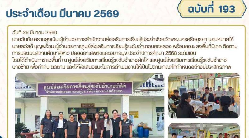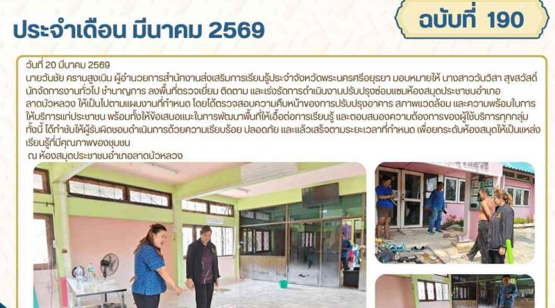 จดหมายข่าว admin 20 มีนาคม 20262 เมษายน 2026 ลงพื้นที่ตรวจเยี่ยม ติดตาม และเร่งรัดการดำเนินงานปรับปรุงซ่อมแซมห้องสมุดประชาชนอำเภอลาดบัวหลวง วันที่ 20 มีนาคม 256 Read More
