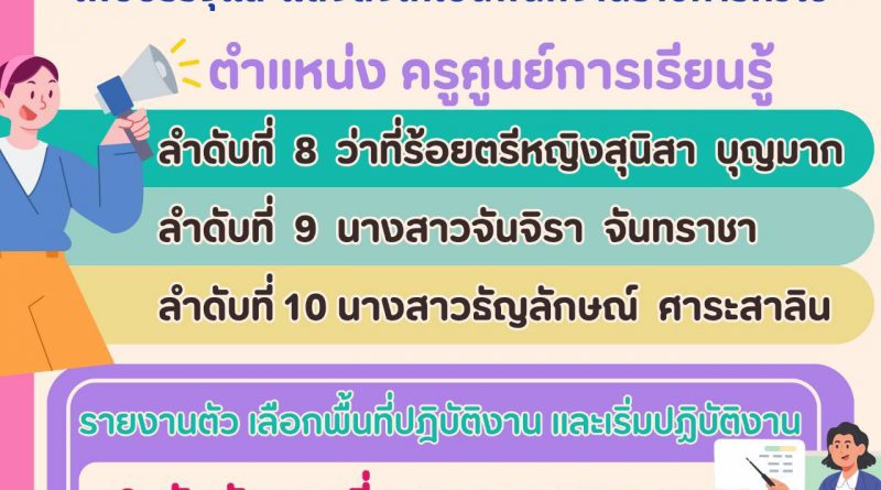 ประกาศ admin 3 เมษายน 20268 เมษายน 2026 เรียกรายงานตัวเพื่อเข้ารับการบรรจุและแต่งตั้งเป็นพนักงานราชการทั่วไป ตำแหน่ง ครูศูนย์การเรียนรู้ ลำดับที่ 8 , 9 และ 10 Read More