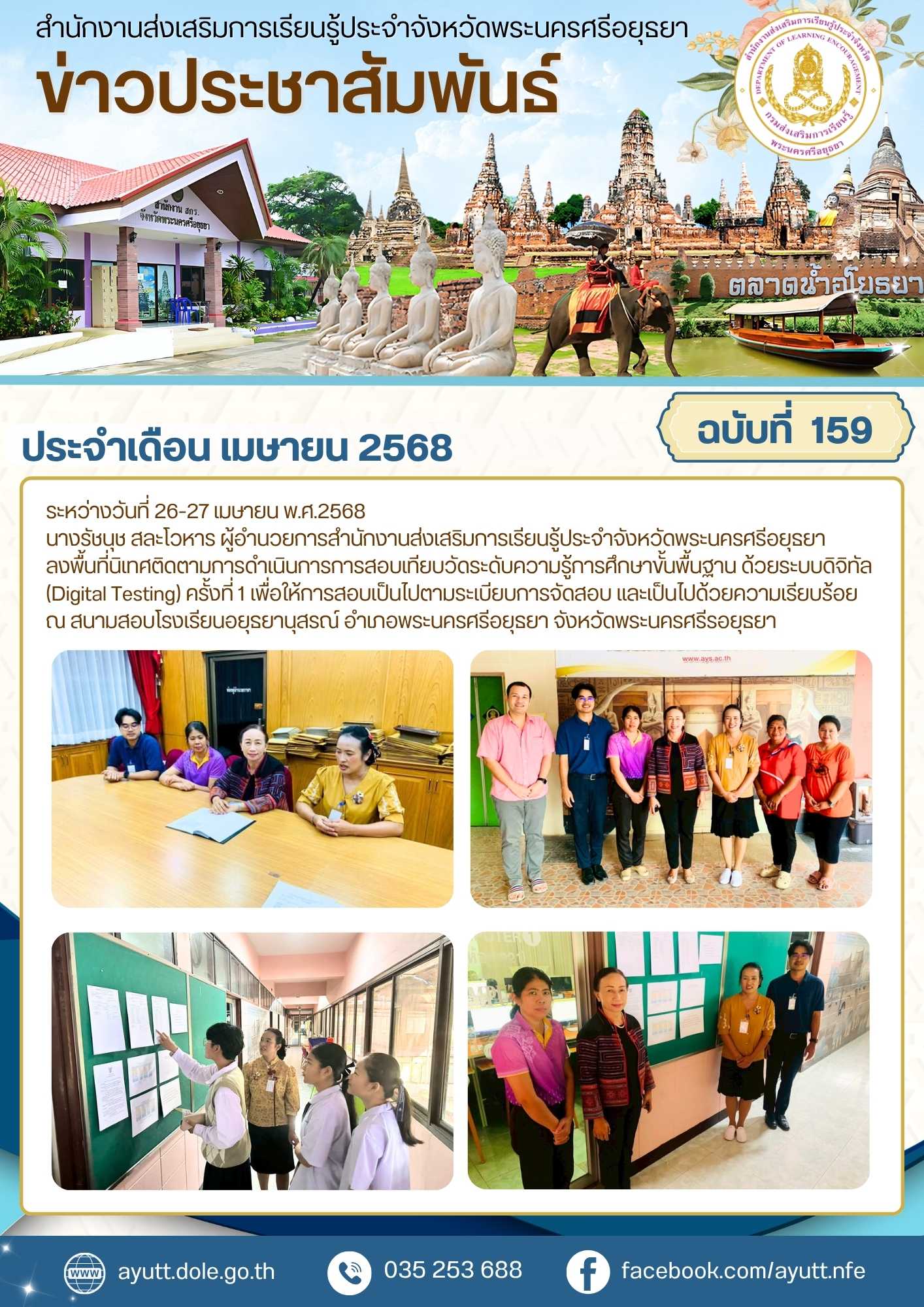 นางรัชนุช สละโวหาร ผู้อำนวยการสำนักงานส่งเสริมการเรียนรู้ประจำจังหวัดพระนครศรีอยุธยา ลงพื้นที่นิเทศติดตามการดำเนินการการสอบเทียบวัดระดับความรู้การศึกษาขั้นพื้นฐาน ด้วยระบบดิจิทัล (Digital Testing) ครั้งที่ 1 เพื่อให้การสอบเป็นไปตามระเบียบการจัดสอบ และเป็นไปด้วยความเรียบร้อย