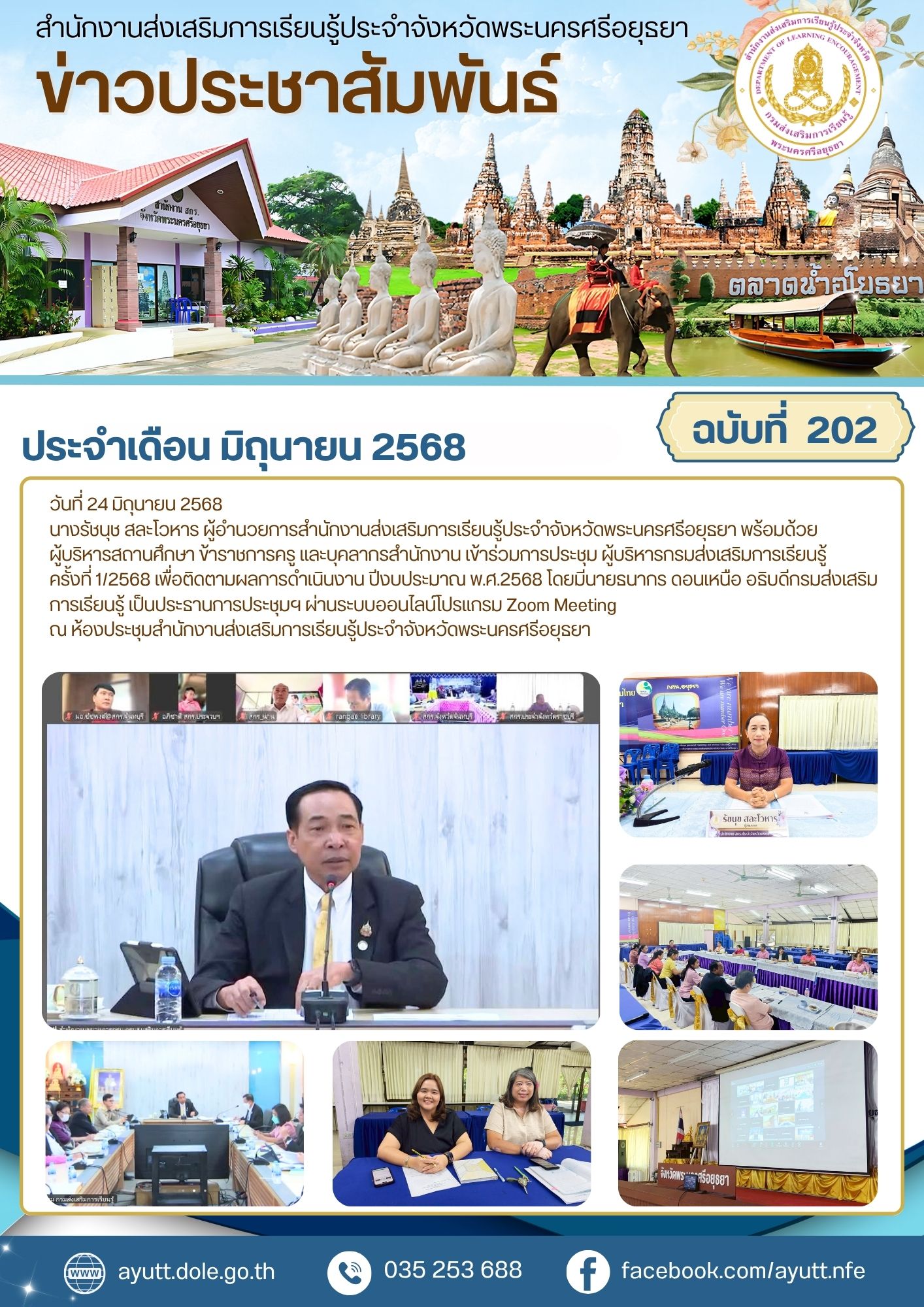 นางรัชนุช สละโวหาร ผู้อำนวยการสำนักงานส่งเสริมการเรียนรู้ประจำจังหวัดพระนครศรีอยุธยา พร้อมด้วย ผู้บริหารสถานศึกษา ข้าราชการครู และบุคลากรสำนักงาน เข้าร่วมการประชุม ผู้บริหารกรมส่งเสริมการเรียนรู้ ครั้งที่ 1/2568 เพื่อติดตามผลการดำเนินงาน ปีงบประมาณ พ.ศ.2568 โดยมีนายธนากร ดอนเหนือ อธิบดีกรมส่งเสริมการเรียนรู้ เป็นประธานการประชุมฯ ผ่านระบบออนไลน์โปรแกรม Zoom Meeting