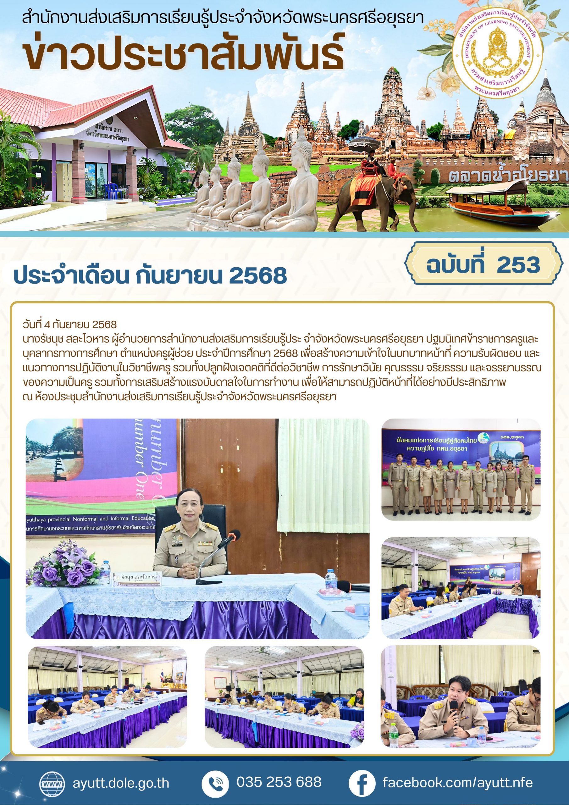 นางรัชนุช สละโวหาร ผู้อำนวยการสำนักงานส่งเสริมการเรียนรู้ประ จำจังหวัดพระนครศรีอยุธยา ปฐมนิเทศข้าราชการครูและบุคลากรทางการศึกษา ตำแหน่งครูผู้ช่วย ประจำปีการศึกษา 2568 เพื่อสร้างความเข้าใจในบทบาทหน้าที่ ความรับผิดชอบ และแนวทางการปฏิบัติงานในวิชาชีพครู รวมทั้งปลูกฝังเจตคติที่ดีต่อวิชาชีพ การรักษาวินัย คุณธรรม จริยธรรม และจรรยาบรรณของความเป็นครู รวมทั้งการเสริมสร้างแรงบันดาลใจในการทำงาน เพื่อให้สามารถปฏิบัติหน้าที่ได้อย่างมีประสิทธิภาพ