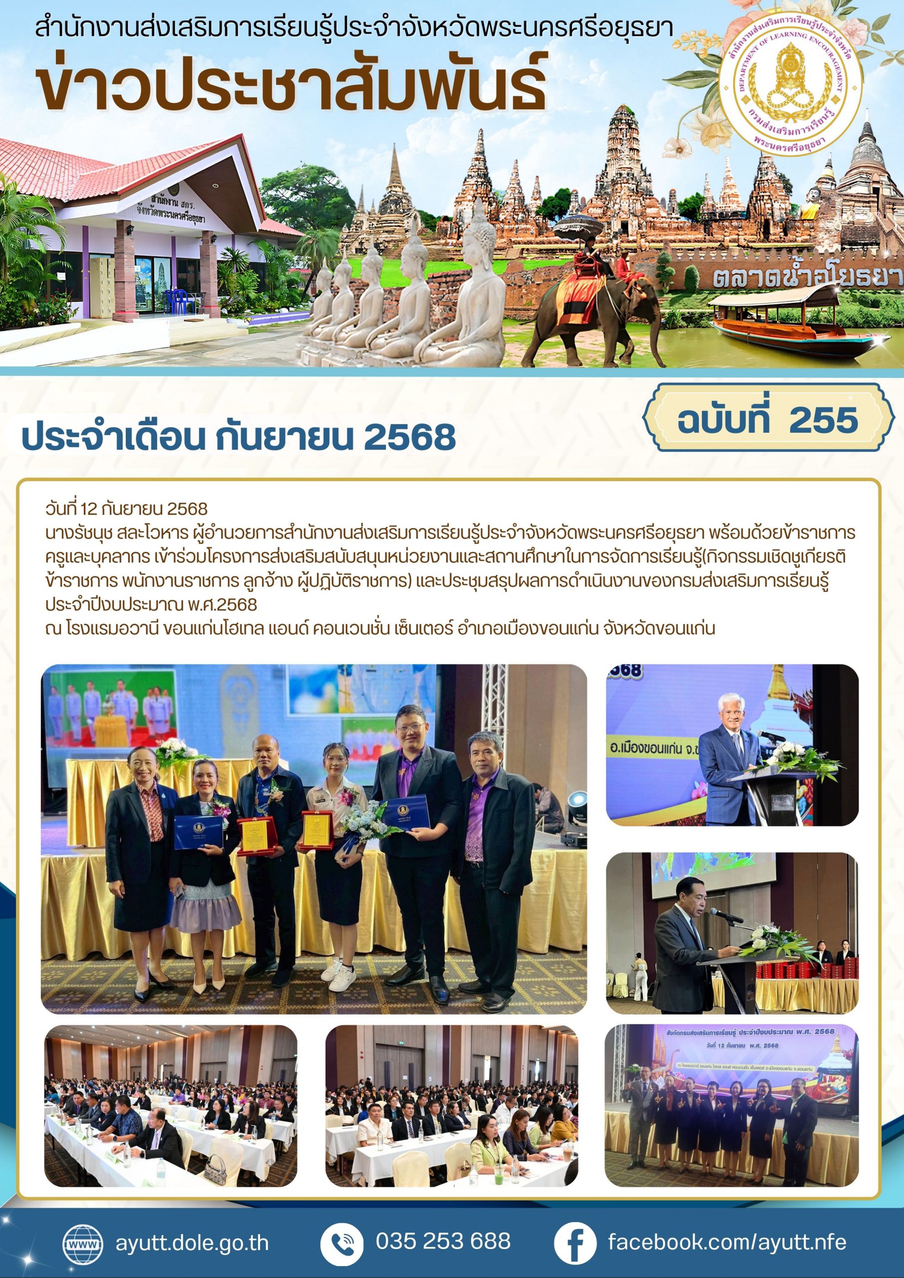 นางรัชนุช สละโวหาร ผู้อำนวยการสำนักงานส่งเสริมการเรียนรู้ประจำจังหวัดพระนครศรีอยุธยา พร้อมด้วยข้าราชการครูและบุคลากร เข้าร่วมโครงการส่งเสริมสนับสนุนหน่วยงานและสถานศึกษาในการจัดการเรียนรู้(กิจกรรมเชิดชูเกียรติข้าราชการ พนักงานราชการ ลูกจ้าง ผู้ปฏิบัติราชการ) และประชุมสรุปผลการดำเนินงานของกรมส่งเสริมการเรียนรู้ ประจำปีงบประมาณ พ.ศ.2568