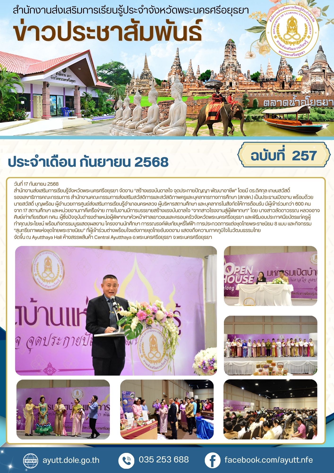 สำนักงานส่งเสริมการเรียนรู้จังหวัดพระนครศรีอยุธยา จัดงาน “สร้างแรงบันดาลใจ จุดประกายปัญญา พัฒนาอาชีพ” โดยมี ดร.ดิศกุล เกษมสวัสดิ์ รองเลขาธิการคณะกรรมการ สำนักงานคณะกรรมการส่งเสริมสวัสดิการและสวัสดิภาพครูและบุคลากรทางการศึกษา (สกสค.) เป็นประธานเปิดงาน