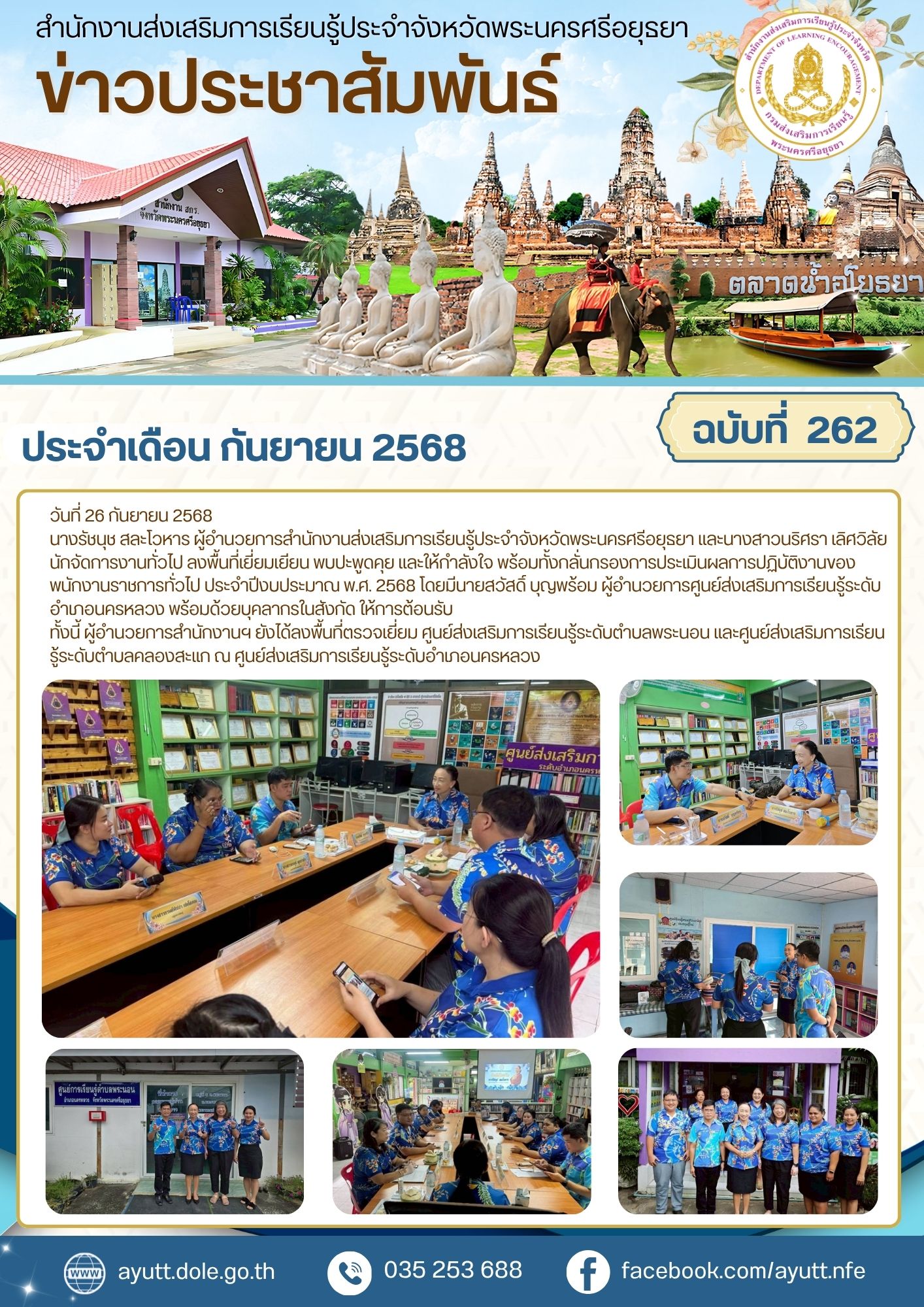 นางรัชนุช สละโวหาร ผู้อำนวยการสำนักงานส่งเสริมการเรียนรู้ประจำจังหวัดพระนครศรีอยุธยา และนางสาวนริศรา เลิศวิลัย นักจัดการงานทั่วไป ลงพื้นที่เยี่ยมเยียน พบปะพูดคุย และให้กำลังใจ พร้อมทั้งกลั่นกรองการประเมินผลการปฏิบัติงานของพนักงานราชการทั่วไป ประจำปีงบประมาณ พ.ศ. 2568 โดยมีนายสวัสดิ์ บุญพร้อม ผู้อำนวยการศูนย์ส่งเสริมการเรียนรู้ระดับอำเภอนครหลวง พร้อมด้วยบุคลากรในสังกัด ให้การต้อนรับ