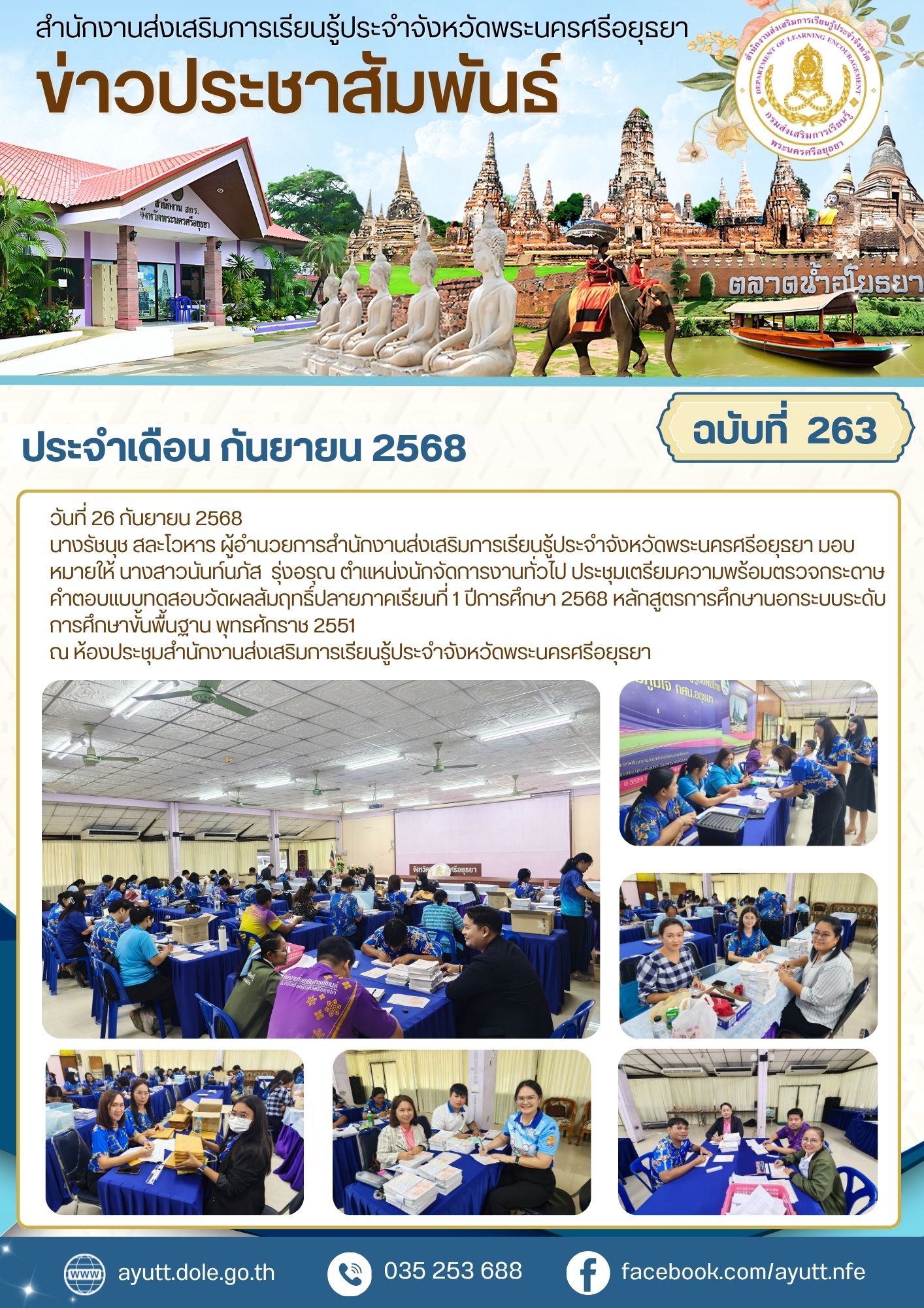 นางรัชนุช สละโวหาร ผู้อำนวยการสำนักงานส่งเสริมการเรียนรู้ประจำจังหวัดพระนครศรีอยุธยา มอบหมายให้ นางสาวนันท์นภัส รุ่งอรุณ ตำแหน่งนักจัดการงานทั่วไป ประชุมเตรียมความพร้อมตรวจกระดาษคำตอบแบบทดสอบวัดผลสัมฤทธิ์ปลายภาคเรียนที่ 1 ปีการศึกษา 2568 หลักสูตรการศึกษานอกระบบระดับการศึกษาขั้นพื้นฐาน พุทธศักราช 2551
