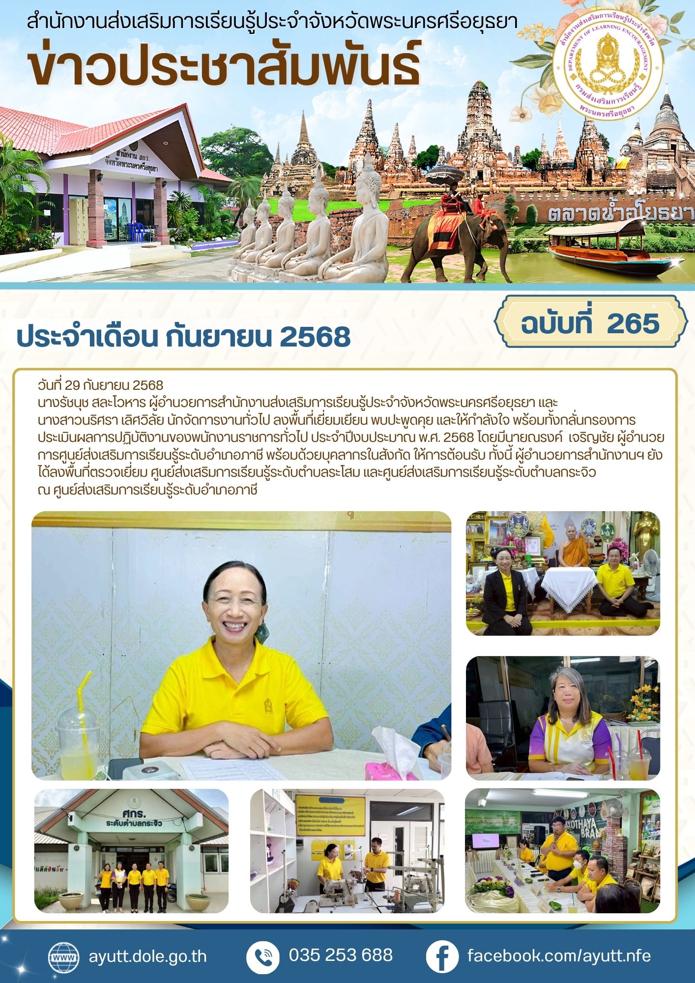 นางรัชนุช สละโวหาร ผู้อำนวยการสำนักงานส่งเสริมการเรียนรู้ประจำจังหวัดพระนครศรีอยุธยา และนางสาวนริศรา เลิศวิลัย นักจัดการงานทั่วไป ลงพื้นที่เยี่ยมเยียน พบปะพูดคุย และให้กำลังใจ พร้อมทั้งกลั่นกรองการประเมินผลการปฏิบัติงานของพนักงานราชการทั่วไป ประจำปีงบประมาณ พ.ศ. 2568 โดยมีนายณรงค์ เจริญชัย ผู้อำนวยการศูนย์ส่งเสริมการเรียนรู้ระดับอำเภอภาชี พร้อมด้วยบุคลากรในสังกัด ให้การต้อนรับ ทั้งนี้ ผู้อำนวยการสำนักงานฯ ยังได้ลงพื้นที่ตรวจเยี่ยม ศูนย์ส่งเสริมการเรียนรู้ระดับตำบลระโสม และศูนย์ส่งเสริมการเรียนรู้ระดับตำบลกระจิว