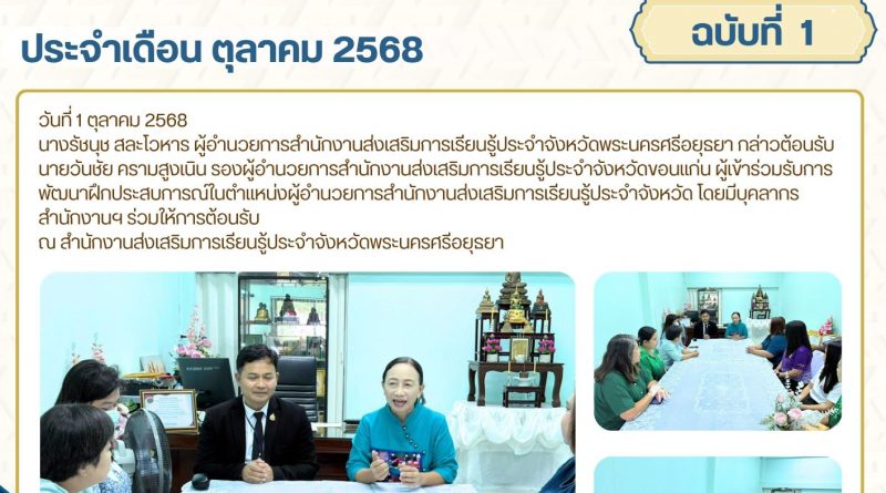 นางรัชนุช สละโวหาร ผู้อำนวยการสำนักงานส่งเสริมการเรียนรู้ประจำจังหวัดพระนครศรีอยุธยา กล่าวต้อนรับ นายวันชัย ครามสูงเนิน รองผู้อำนวยการสำนักงานส่งเสริมการเรียนรู้ประจำจังหวัดขอนแก่น ผู้เข้าร่วมรับการพัฒนาฝึกประสบการณ์ในตำแหน่งผู้อำนวยการสำนักงานส่งเสริมการเรียนรู้ประจำจังหวัด โดยมีบุคลากรสำนักงานฯ ร่วมให้การต้อนรับ