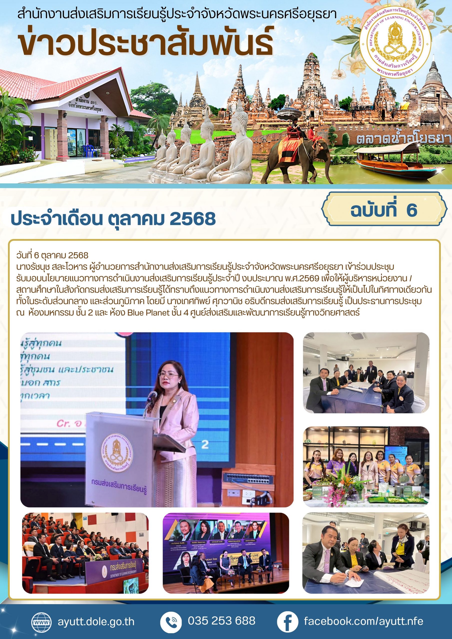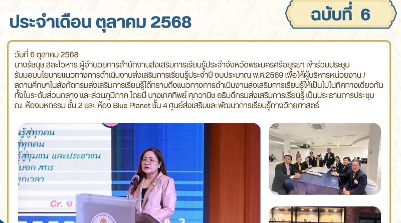 นางรัชนุช สละโวหาร ผู้อำนวยการสำนักงานส่งเสริมการเรียนรู้ประจำจังหวัดพระนครศรีอยุธยา เข้าร่วมประชุมรับมอบนโยบายแนวทางการดำเนินงานส่งเสริมการเรียนรู้ประจำปี งบประมาณ พ.ศ.2569 เพื่อให้ผู้บริหารหน่วยงาน / สถานศึกษาในสังกัดกรมส่งเสริมการเรียนรู้ได้ทราบถึงแนวทางการดำเนินงานส่งเสริมการเรียนรู้ให้เป็นไปในทิศทางเดียวกันทั้งในระดับส่วนกลาง และส่วนภูมิภาค โดยมี นางเกศทิพย์ ศุภวานิช อธิบดีกรมส่งเสริมการเรียนรู้ เป็นประธานการประชุม