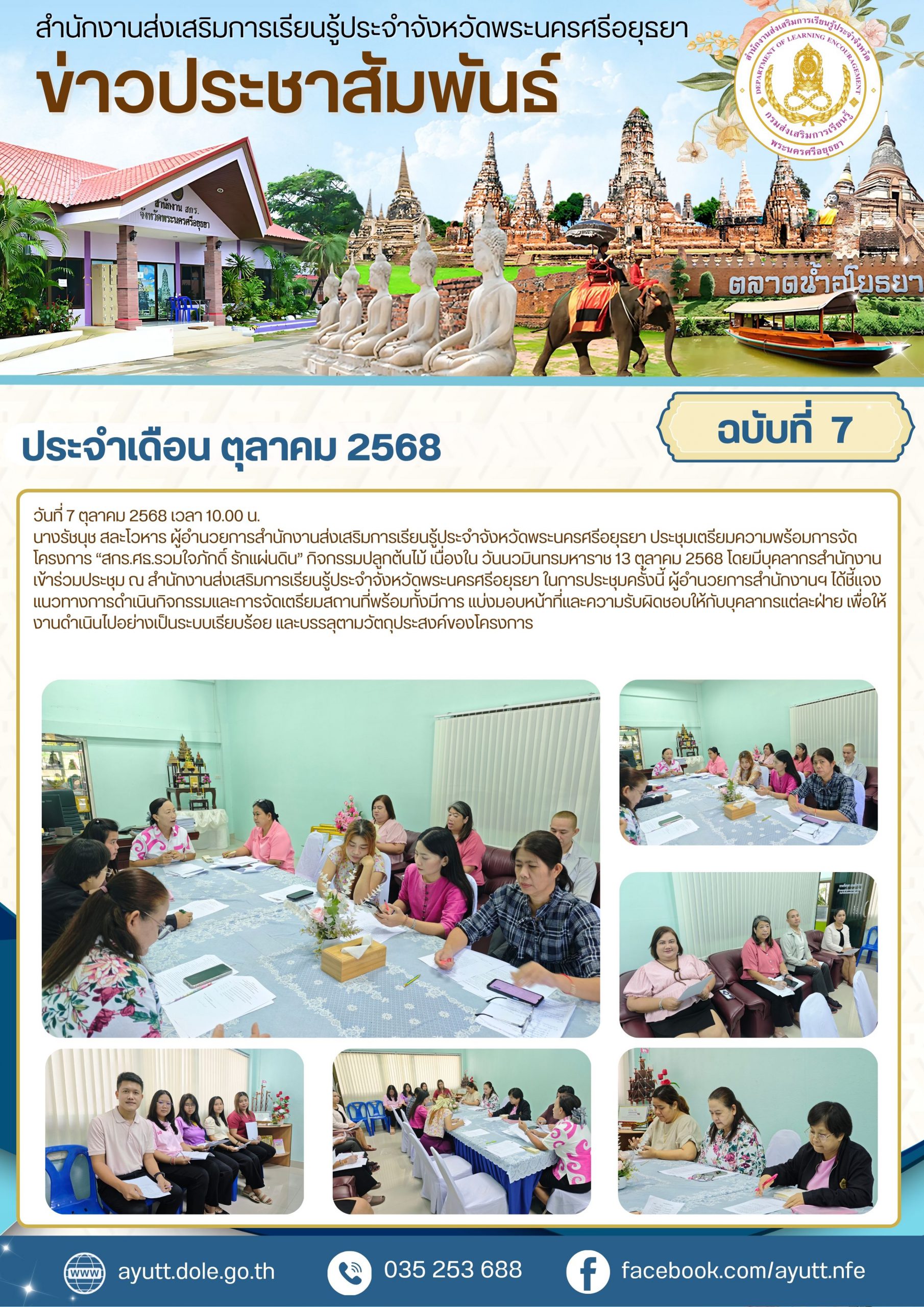 นางรัชนุช สละโวหาร ผู้อำนวยการสำนักงานส่งเสริมการเรียนรู้ประจำจังหวัดพระนครศรีอยุธยา ประชุมเตรียมความพร้อมการจัดโครงการ “สกร.ศธ.รวมใจภักดิ์ รักแผ่นดิน” กิจกรรมปลูกต้นไม้ เนื่องใน วันนวมินทรมหาราช 13 ตุลาคม 2568 โดยมีบุคลากรสำนักงานเข้าร่วมประชุม ณ สำนักงานส่งเสริมการเรียนรู้ประจำจังหวัดพระนครศรีอยุธยา