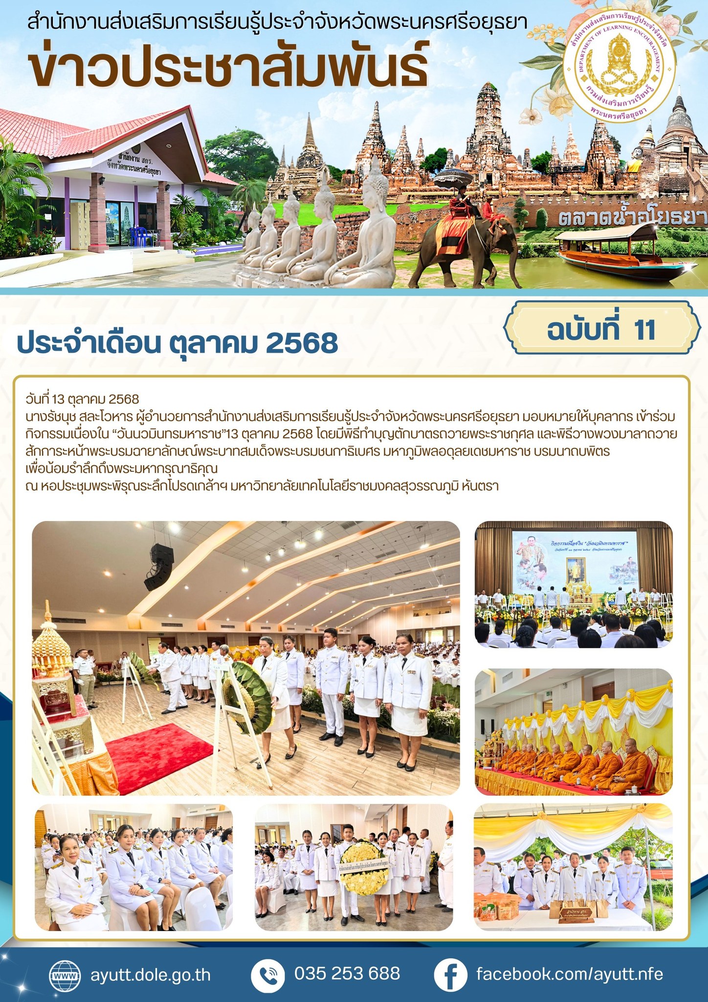 นางรัชนุช สละโวหาร ผู้อำนวยการสำนักงานส่งเสริมการเรียนรู้ประจำจังหวัดพระนครศรีอยุธยา มอบหมายให้บุคลากร เข้าร่วมกิจกรรมเนื่องใน “วันนวมินทรมหาราช”13 ตุลาคม 2568 โดยมีพิธีทำบุญตักบาตรถวายพระราชกุศล และพิธีวางพวงมาลาถวายสักการะหน้าพระบรมฉายาลักษณ์พระบาทสมเด็จพระบรมชนกาธิเบศร มหาภูมิพลอดุลยเดชมหาราช บรมนาถบพิตร