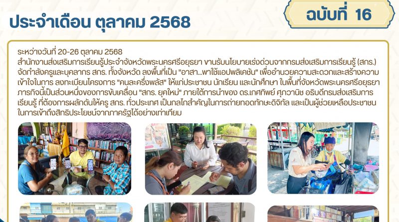 สำนักงานส่งเสริมการเรียนรู้ประจำจังหวัดพระนครศรีอยุธยา ขานรับนโยบายเร่งด่วนจากกรมส่งเสริมการเรียนรู้ (สกร.) จัดกำลังครูและบุคลากร สกร. ทั้งจังหวัด ลงพื้นที่เป็น “อาสา…พาใช้แอปพลิเคชัน” เพื่ออำนวยความสะดวกและสร้างความเข้าใจในการ ลงทะเบียนโครงการ “คนละครึ่งพลัส” ให้แก่ประชาชน นักเรียน และนักศึกษา ในพื้นที่จังหวัดพระนครศรีอยุธยา
