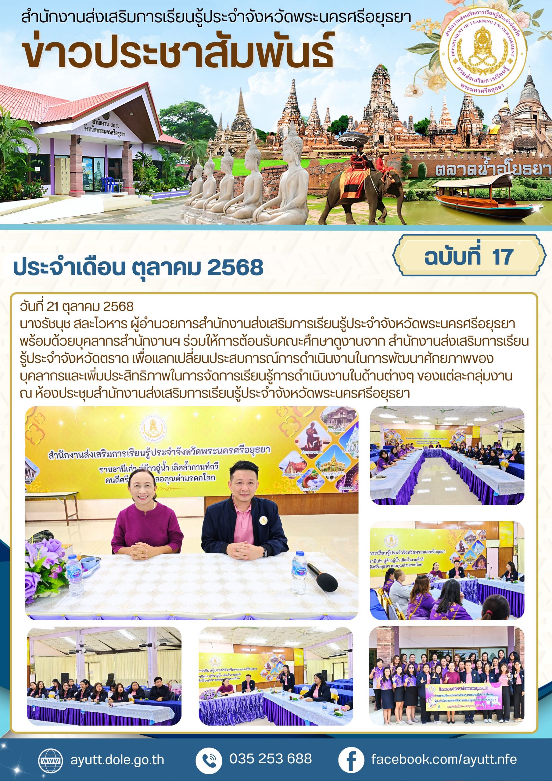นางรัชนุช สละโวหาร ผู้อำนวยการสำนักงานส่งเสริมการเรียนรู้ประจำจังหวัดพระนครศรีอยุธยา พร้อมด้วยบุคลากรสำนักงานฯ ให้การต้อนรับคณะศึกษาดูงานจากสำนักงานส่งเสริมการเรียนรู้ประจำจังหวัดตราด นำโดย นายธีรภัทร อินทร์ศวร รองผู้อำนวยการสำนักงานส่งเสริมการเรียนรู้ประจำจังหวัดตราด รักษาการผู้อำนวยการสำนักงานส่งเสริมการเรียนรู้ประจำจังหวัดตราด
