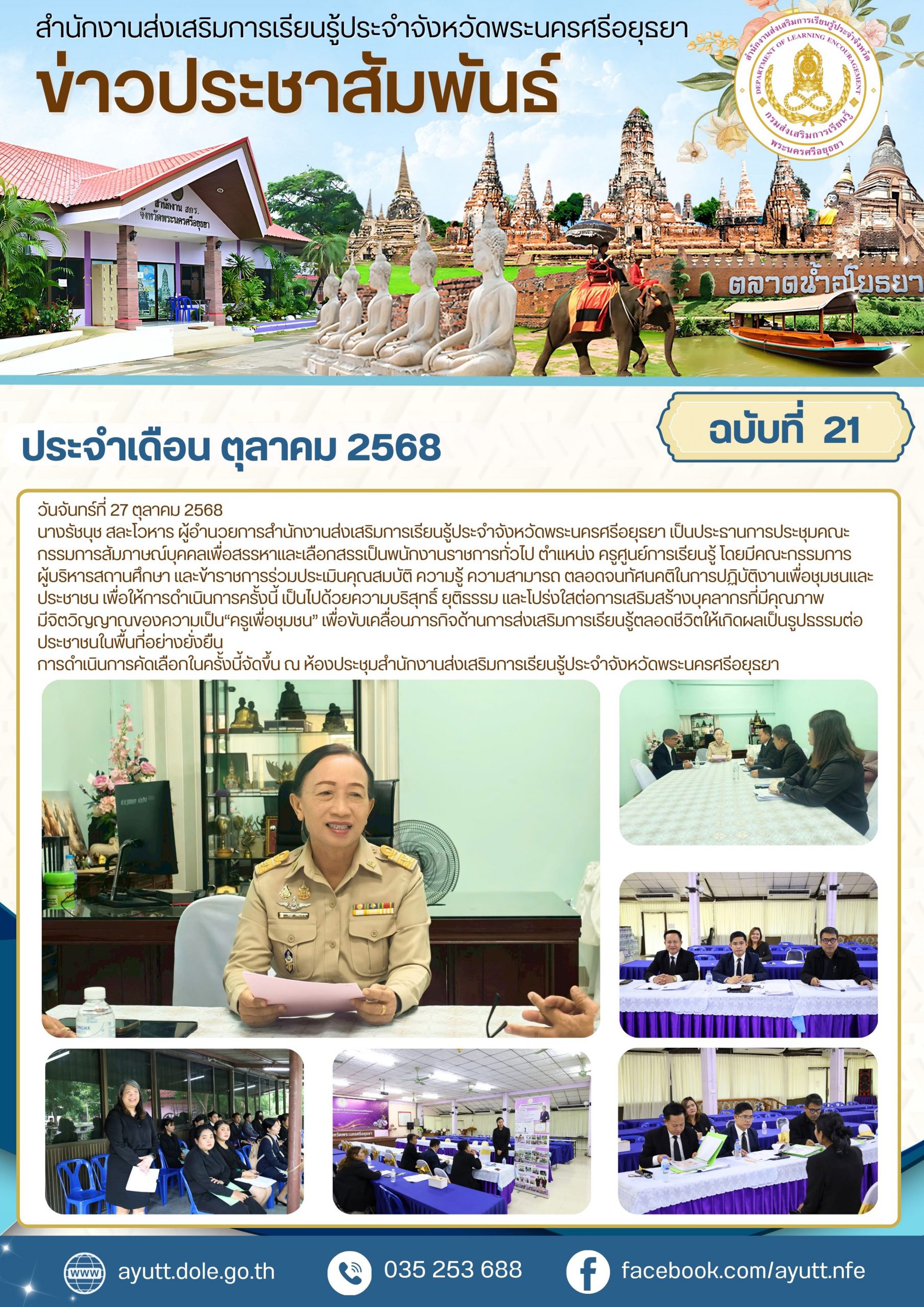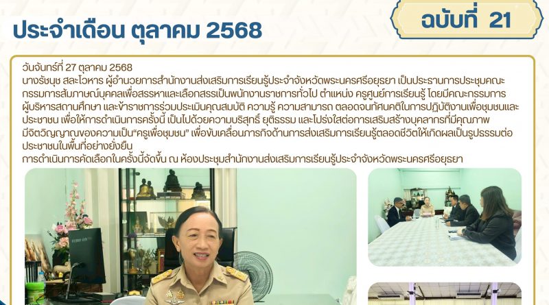 นางรัชนุช สละโวหาร ผู้อำนวยการสำนักงานส่งเสริมการเรียนรู้ประจำจังหวัดพระนครศรีอยุธยา เป็นประธานการประชุมคณะกรรมการสัมภาษณ์บุคคลเพื่อสรรหาและเลือกสรรเป็นพนักงานราชการทั่วไป ตำแหน่ง ครูศูนย์การเรียนรู้ ตามที่สำนักงานส่งเสริมการเรียนรู้ประจำจังหวัดพระนครศรีอยุธยา ได้ขอใช้บัญชีตำแหน่ง ครูศูนย์การเรียนรู้ จากสำนักงานส่งเสริมการเรียนรู้ประจำจังหวัดสุพรรณบุรี เพื่อทดแทนตำแหน่งที่ว่างและเสริมความพร้อมในการดำเนินงานด้านการส่งเสริมการเรียนรู้ในพื้นที่