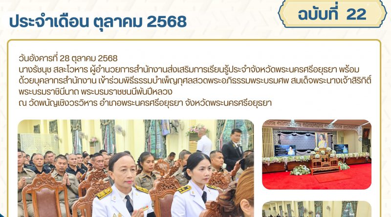 นางรัชนุช สละโวหาร ผู้อำนวยการสำนักงานส่งเสริมการเรียนรู้ประจำจังหวัดพระนครศรีอยุธยา พร้อมด้วยบุคลากรสำนักงาน เข้าร่วมพิธีธรรมบำเพ็ญกุศลสวดพระอภิธรรมพระบรมศพ สมเด็จพระนางเจ้าสิริกิติ์ พระบรมราชินีนาถ พระบรมราชชนนีพันปีหลวง ณ วัดพนัญเชิงวรวิหาร อำเภอพระนครศรีอยุธยา จังหวัดพระนครศรีอยุธยา