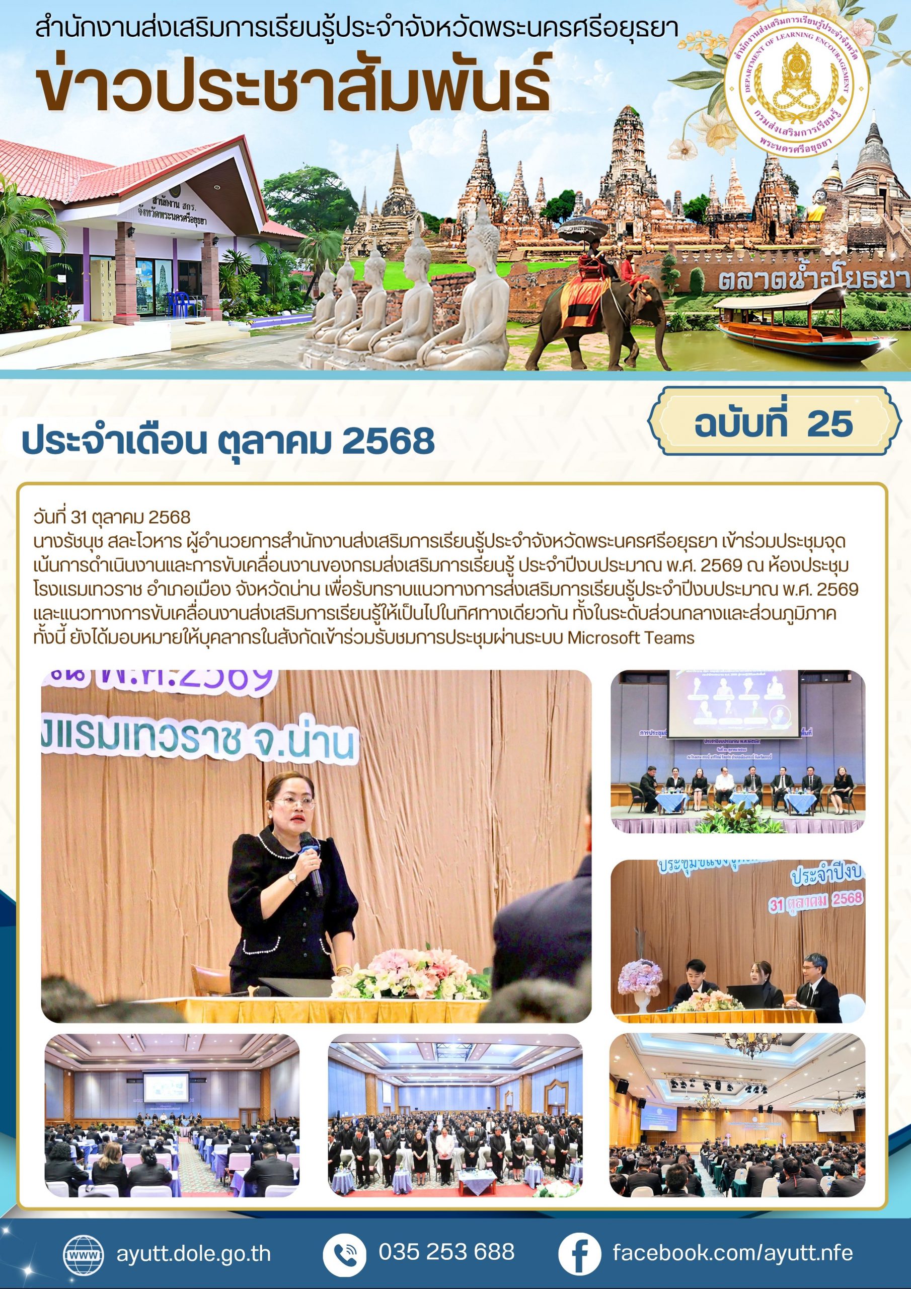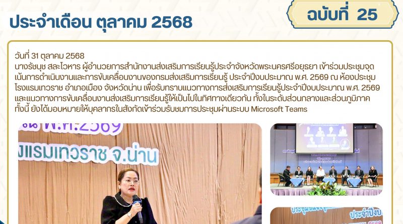 นางรัชนุช สละโวหาร ผู้อำนวยการสำนักงานส่งเสริมการเรียนรู้ประจำจังหวัดพระนครศรีอยุธยา เข้าร่วมประชุมจุดเน้นการดำเนินงานและการขับเคลื่อนงานของกรมส่งเสริมการเรียนรู้ ประจำปีงบประมาณ พ.ศ. 2569 ณ ห้องประชุมโรงแรมเทวราช อำเภอเมือง จังหวัดน่าน เพื่อรับทราบแนวทางการส่งเสริมการเรียนรู้ประจำปีงบประมาณ พ.ศ. 2569 และแนวทางการขับเคลื่อนงานส่งเสริมการเรียนรู้ให้เป็นไปในทิศทางเดียวกัน ทั้งในระดับส่วนกลางและส่วนภูมิภาค