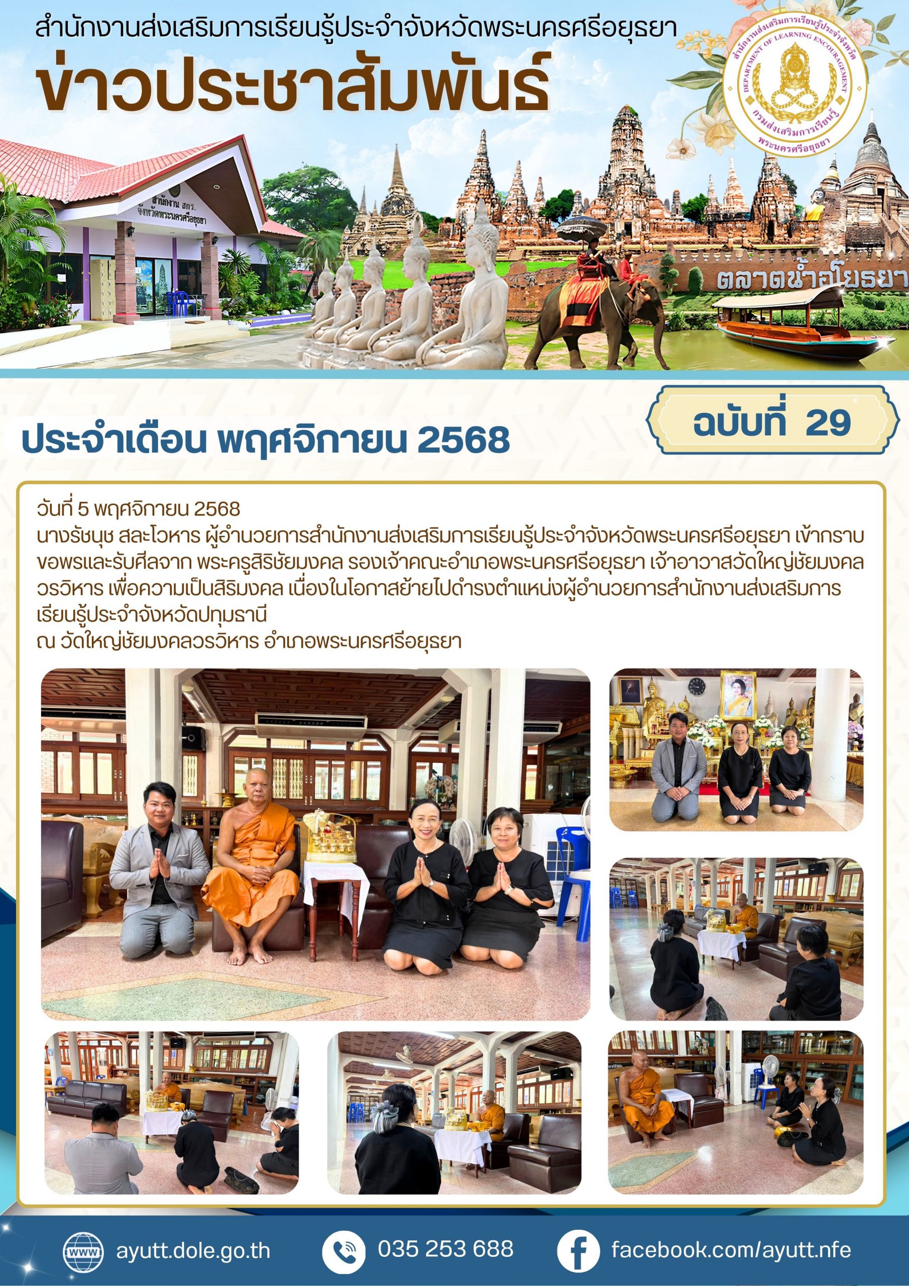 นางรัชนุช สละโวหาร ผู้อำนวยการสำนักงานส่งเสริมการเรียนรู้ประจำจังหวัดพระนครศรีอยุธยา เข้ากราบขอพรและรับศีลจาก พระครูสิริชัยมงคล รองเจ้าคณะอำเภอพระนครศรีอยุธยา เจ้าอาวาสวัดใหญ่ชัยมงคลวรวิหาร เพื่อความเป็นสิริมงคล เนื่องในโอกาสย้ายไปดำรงตำแหน่งผู้อำนวยการสำนักงานส่งเสริมการเรียนรู้ประจำจังหวัดปทุมธานี