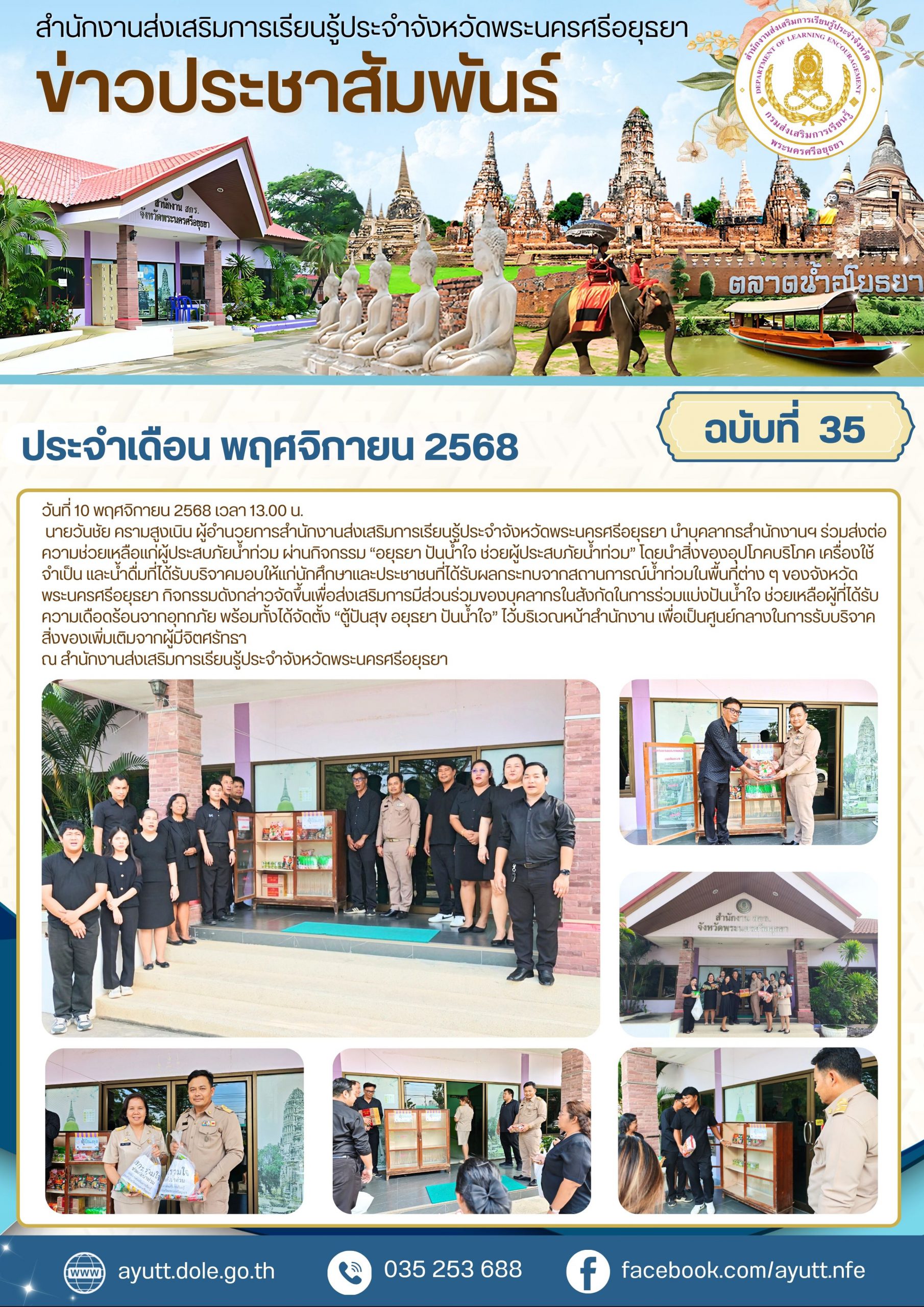 นายวันชัย ครามสูงเนิน ผู้อำนวยการสำนักงานส่งเสริมการเรียนรู้ประจำจังหวัดพระนครศรีอยุธยา นำบุคลากรสำนักงานฯ ร่วมส่งต่อความช่วยเหลือแก่ผู้ประสบภัยน้ำท่วม ผ่านกิจกรรม “อยุธยา ปันน้ำใจ ช่วยผู้ประสบภัยน้ำท่วม” โดยนำสิ่งของอุปโภคบริโภค เครื่องใช้จำเป็น และน้ำดื่มที่ได้รับบริจาคมอบให้แก่นักศึกษาและประชาชนที่ได้รับผลกระทบจากสถานการณ์น้ำท่วมในพื้นที่ต่าง ๆ ของจังหวัดพระนครศรีอยุธยา