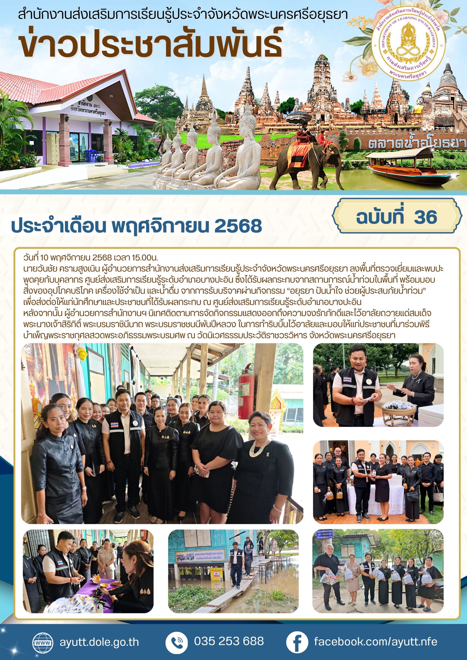 นายวันชัย ครามสูงเนิน ผู้อำนวยการสำนักงานส่งเสริมการเรียนรู้ประจำจังหวัดพระนครศรีอยุธยา ลงพื้นที่ตรวจเยี่ยมและพบปะพูดคุยกับบุคลากร ศูนย์ส่งเสริมการเรียนรู้ระดับอำเภอบางปะอิน ซึ่งได้รับผลกระทบจากสถานการณ์น้ำท่วมในพื้นที่ พร้อมมอบสิ่งของอุปโภคบริโภค เครื่องใช้จำเป็น และน้ำดื่ม จากการรับบริจาคผ่านกิจกรรม “อยุธยา ปันน้ำใจ ช่วยผู้ประสบภัยน้ำท่วม”