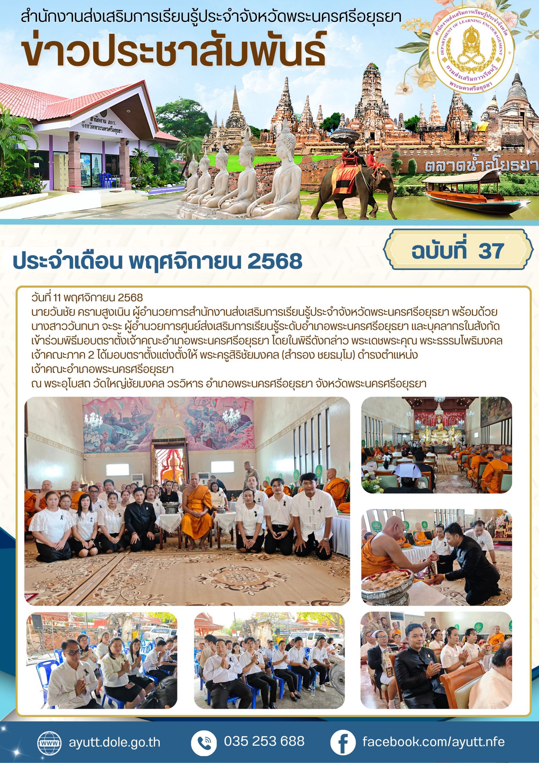 นายวันชัย ครามสูงเนิน ผู้อำนวยการสำนักงานส่งเสริมการเรียนรู้ประจำจังหวัดพระนครศรีอยุธยา พร้อมด้วย นางสาววันทนา จะระ ผู้อำนวยการศูนย์ส่งเสริมการเรียนรู้ระดับอำเภอพระนครศรีอยุธยา และบุคลากรในสังกัด เข้าร่วมพิธีมอบตราตั้งเจ้าคณะอำเภอพระนครศรีอยุธยา โดยในพิธีดังกล่าว พระเดชพระคุณ พระธรรมโพธิมงคล เจ้าคณะภาค 2 ได้มอบตราตั้งแต่งตั้งให้ พระครูสิริชัยมงคล (สำรอง ชยธมฺโม) ดำรงตำแหน่งเจ้าคณะอำเภอพระนครศรีอยุธยา