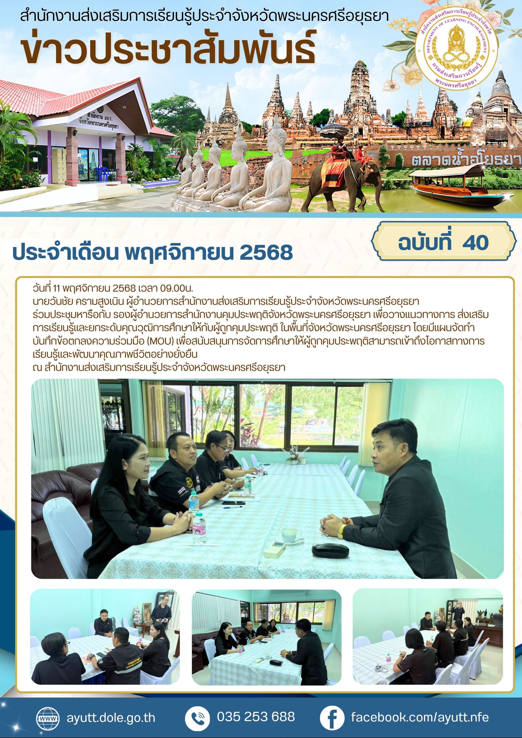 ร่วมประชุมหารือกับ รองผู้อำนวยการสำนักงานคุมประพฤติจังหวัดพระนครศรีอยุธยา เพื่อวางแนวทางการ ส่งเสริมการเรียนรู้และยกระดับคุณวุฒิการศึกษาให้กับผู้ถูกคุมประพฤติ ในพื้นที่จังหวัดพระนครศรีอยุธยา โดยมีแผนจัดทำ บันทึกข้อตกลงความร่วมมือ (MOU) เพื่อสนับสนุนการจัดการศึกษาให้ผู้ถูกคุมประพฤติสามารถเข้าถึงโอกาสทางการเรียนรู้และพัฒนาคุณภาพชีวิตอย่างยั่งยืน