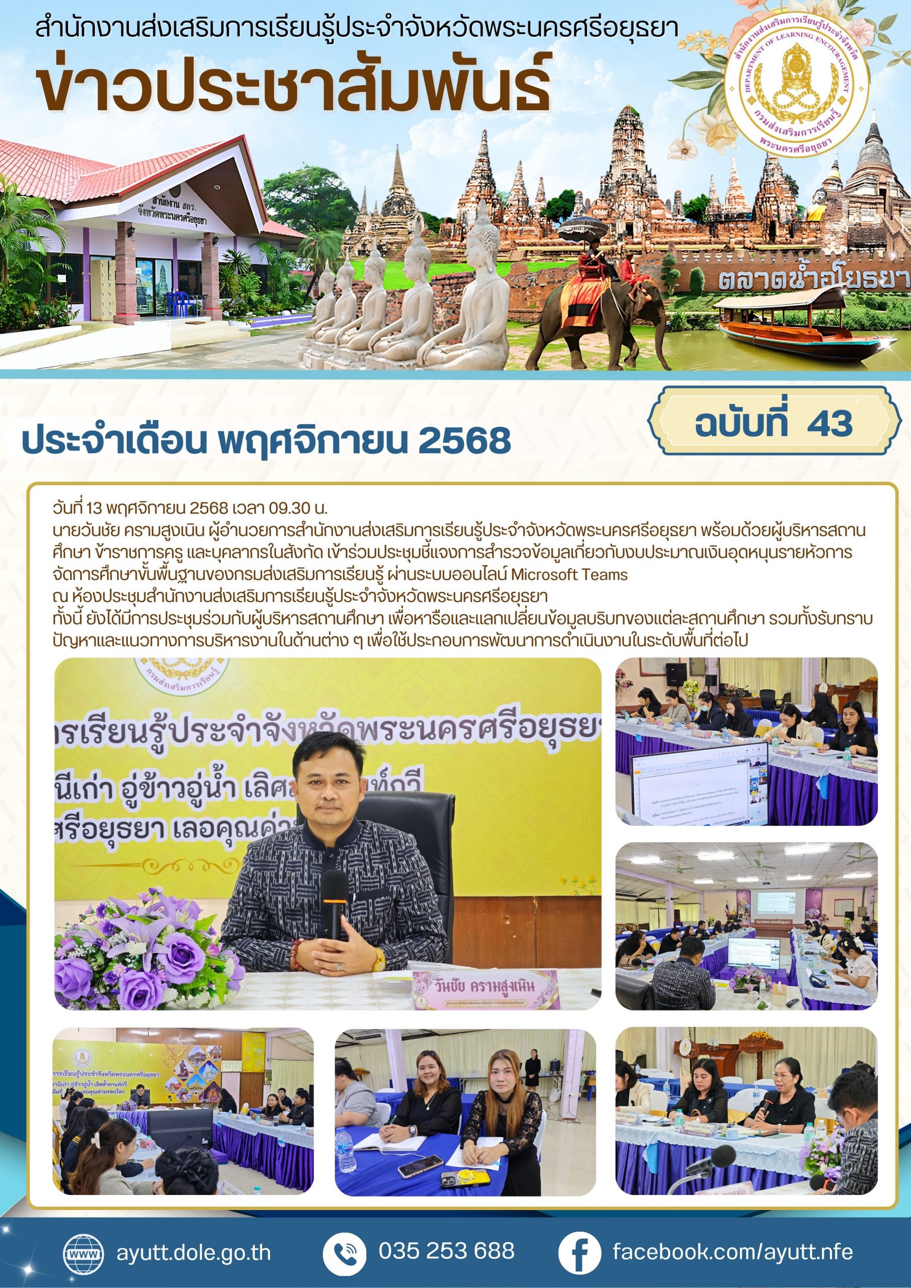 นายวันชัย ครามสูงเนิน ผู้อำนวยการสำนักงานส่งเสริมการเรียนรู้ประจำจังหวัดพระนครศรีอยุธยา พร้อมด้วยผู้บริหารสถานศึกษา ข้าราชการครู และบุคลากรในสังกัด เข้าร่วมประชุมชี้แจงการสำรวจข้อมูลเกี่ยวกับงบประมาณเงินอุดหนุนรายหัวการจัดการศึกษาขั้นพื้นฐานของกรมส่งเสริมการเรียนรู้ ผ่านระบบออนไลน์ Microsoft Teams ณ ห้องประชุมสำนักงานส่งเสริมการเรียนรู้ประจำจังหวัดพระนครศรีอยุธยา