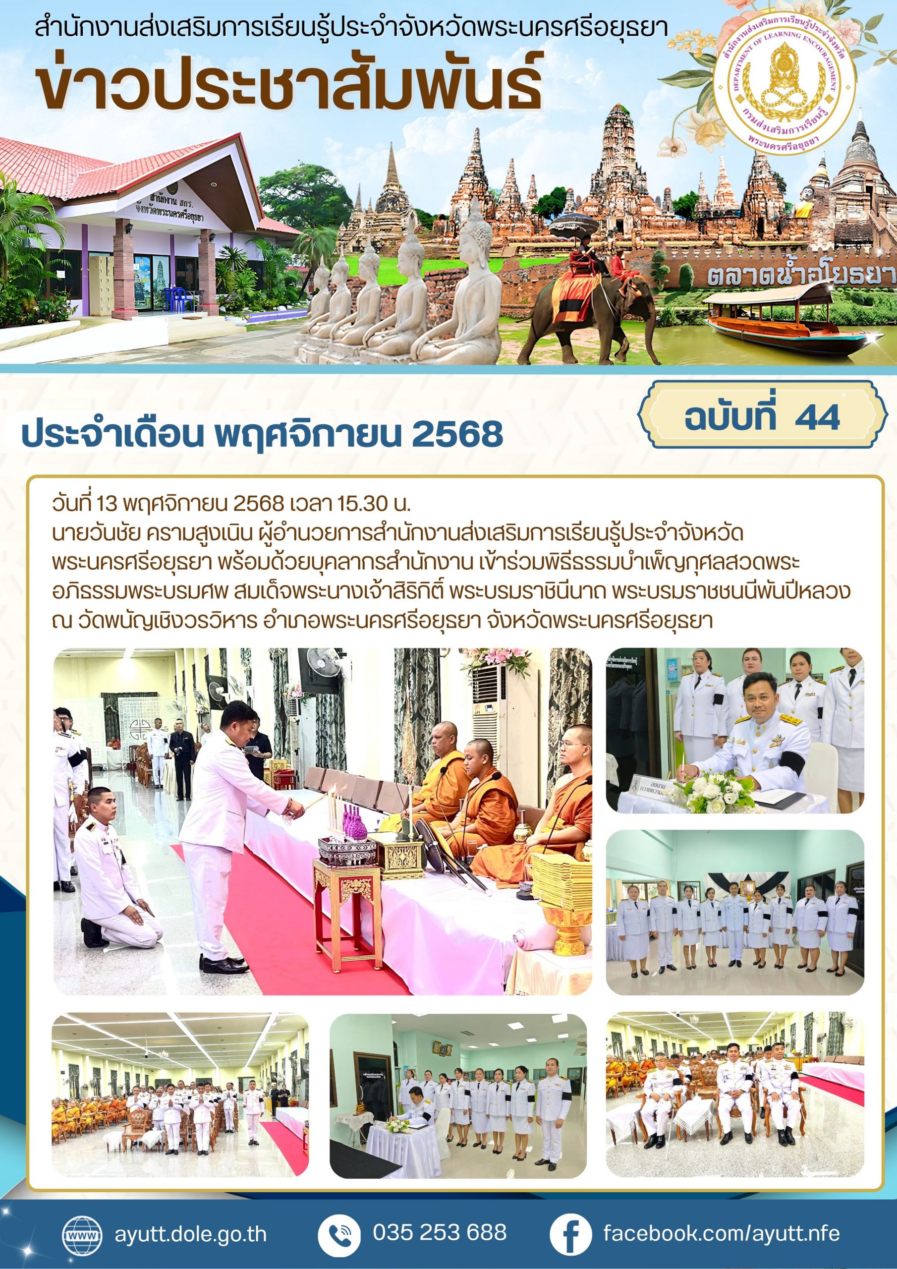 นายวันชัย ครามสูงเนิน ผู้อำนวยการสำนักงานส่งเสริมการเรียนรู้ประจำจังหวัดพระนครศรีอยุธยา พร้อมด้วยบุคลากรสำนักงาน เข้าร่วมพิธีธรรมบำเพ็ญกุศลสวดพระอภิธรรมพระบรมศพ สมเด็จพระนางเจ้าสิริกิติ์ พระบรมราชินีนาถ พระบรมราชชนนีพันปีหลวง