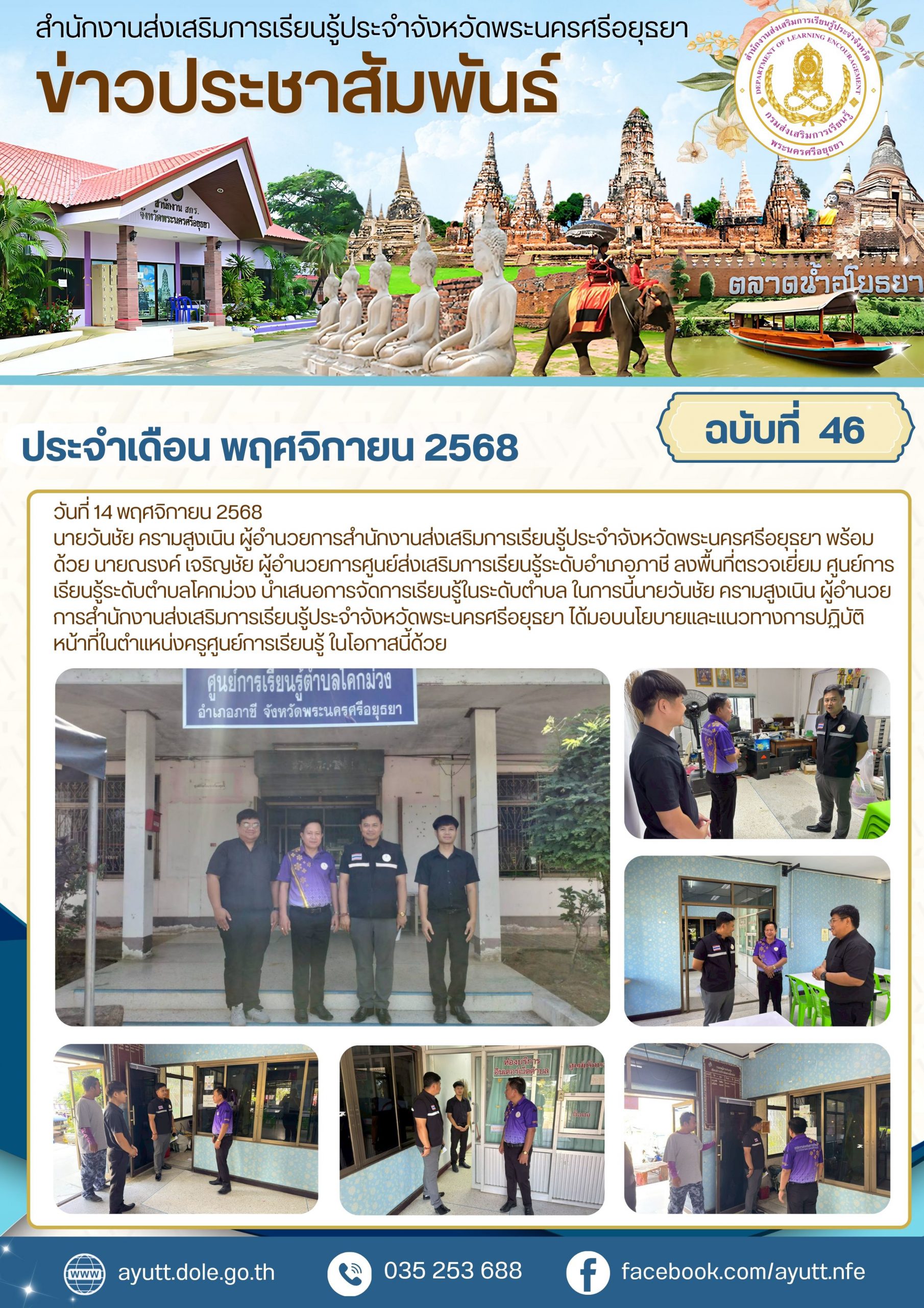 นายวันชัย ครามสูงเนิน ผู้อำนวยการสำนักงานส่งเสริมการเรียนรู้ประจำจังหวัดพระนครศรีอยุธยา พร้อมด้วย นายณรงค์ เจริญชัย ผู้อำนวยการศูนย์ส่งเสริมการเรียนรู้ระดับอำเภอภาชี ลงพื้นที่ตรวจเยี่ยม ศูนย์การเรียนรู้ระดับตำบลโคกม่วง นำเสนอการจัดการเรียนรู้ในระดับตำบล ในการนี้นายวันชัย ครามสูงเนิน ผู้อำนวยการสำนักงานส่งเสริมการเรียนรู้ประจำจังหวัดพระนครศรีอยุธยา ได้มอบนโยบายและแนวทางการปฏิบัติหน้าที่ในตำแหน่งครูศูนย์การเรียนรู้ ในโอกาสนี้ด้วย