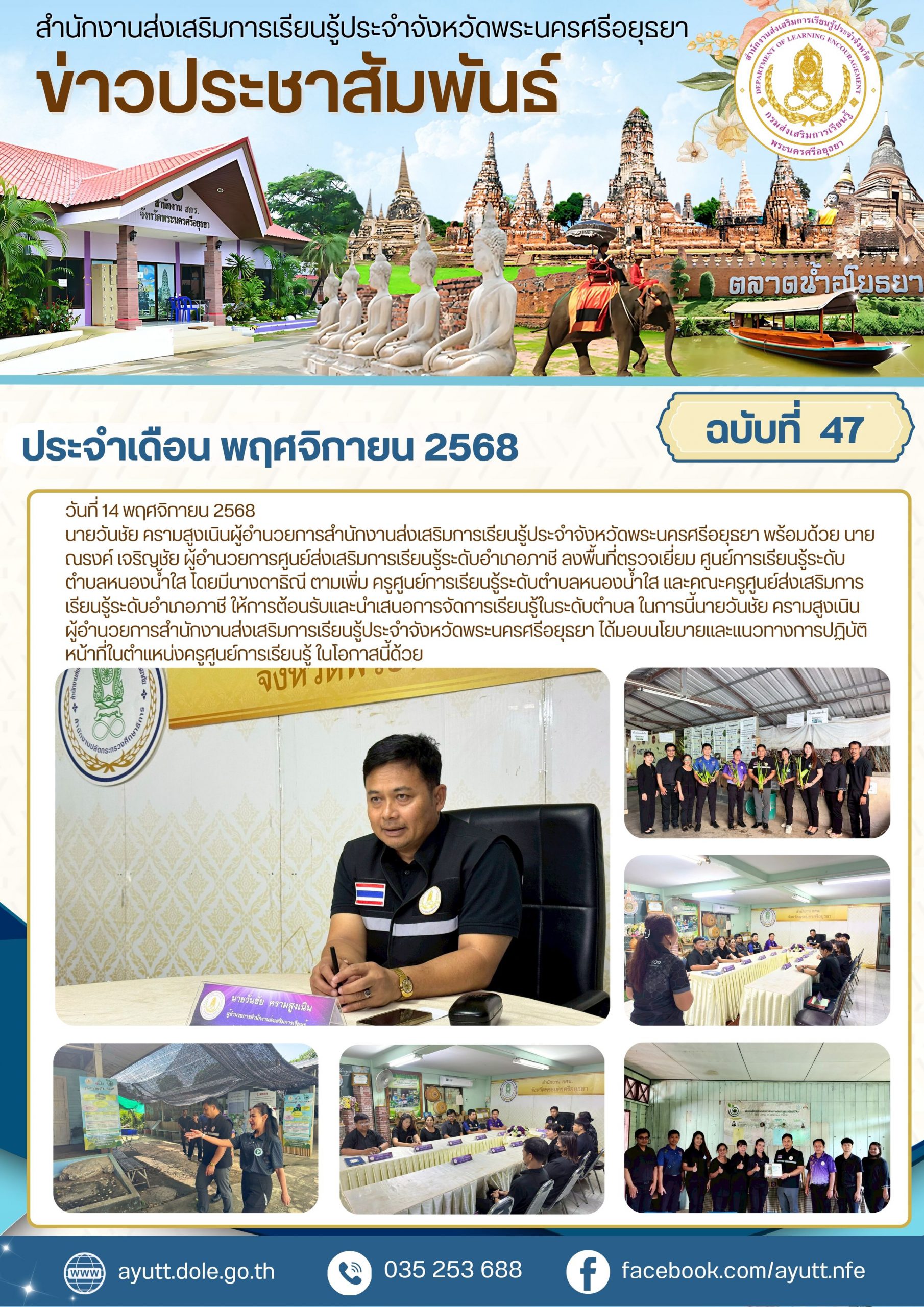 นายวันชัย ครามสูงเนิน ผู้อำนวยการสำนักงานส่งเสริมการเรียนรู้ประจำจังหวัดพระนครศรีอยุธยา พร้อมด้วย นายณรงค์ เจริญชัย ผู้อำนวยการศูนย์ส่งเสริมการเรียนรู้ระดับอำเภอภาชี ลงพื้นที่ตรวจเยี่ยม ศูนย์การเรียนรู้ระดับตำบลหนองน้ำใส โดยมีนางดาธิณี ตามเพิ่ม ครูศูนย์การเรียนรู้ระดับตำบลหนองน้ำใส และคณะครูศูนย์ส่งเสริมการเรียนรู้ระดับอำเภอภาชี ให้การต้อนรับและนำเสนอการจัดการเรียนรู้ในระดับตำบล ในการนี้นายวันชัย ครามสูงเนิน ผู้อำนวยการสำนักงานส่งเสริมการเรียนรู้ประจำจังหวัดพระนครศรีอยุธยา ได้มอบนโยบายและแนวทางการปฏิบัติหน้าที่ในตำแหน่งครูศูนย์การเรียนรู้ ในโอกาสนี้ด้วย
