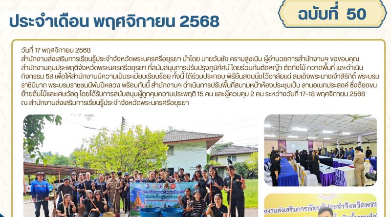 สำนักงานส่งเสริมการเรียนรู้ประจำจังหวัดพระนครศรีอยุธยา นำโดย นายวันชัย ครามสูงเนิน ผู้อำนวยการสำนักงานฯ ขอขอบคุณสำนักงานคุมประพฤติจังหวัดพระนครศรีอยุธยา ที่สนับสนุนการปรับปรุงภูมิทัศน์ โดยร่วมกันตัดหญ้า ตัดกิ่งไม้ กวาดพื้นที่ และดำเนินกิจกรรม 5ส เพื่อให้สำนักงานมีความเป็นระเบียบเรียบร้อย