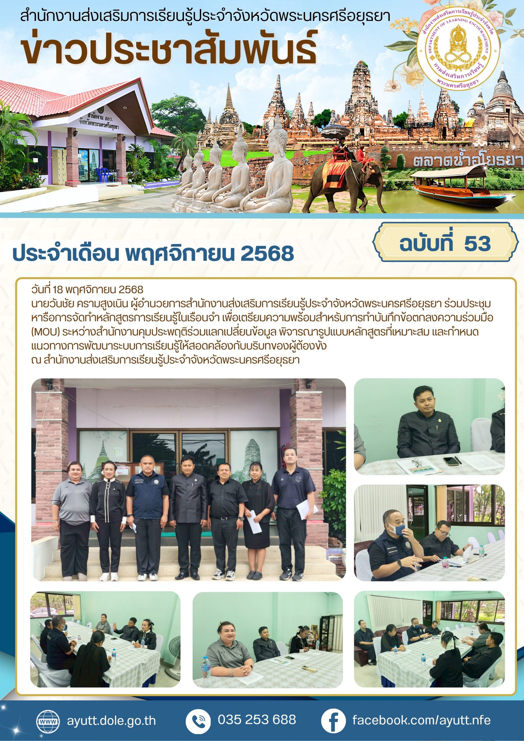 นายวันชัย ครามสูงเนิน ผู้อำนวยการสำนักงานส่งเสริมการเรียนรู้ประจำจังหวัดพระนครศรีอยุธยา ร่วมประชุมหารือการจัดทำหลักสูตรการเรียนรู้ในเรือนจำ เพื่อเตรียมความพร้อมสำหรับการทำบันทึกข้อตกลงความร่วมมือ (MOU) ระหว่างสำนักงานคุมประพฤติ ในการร่วมแลกเปลี่ยนข้อมูล พิจารณารูปแบบหลักสูตรที่เหมาะสม และกำหนดแนวทางการพัฒนาระบบการเรียนรู้ให้สอดคล้องกับบริบทของผู้ต้องขัง