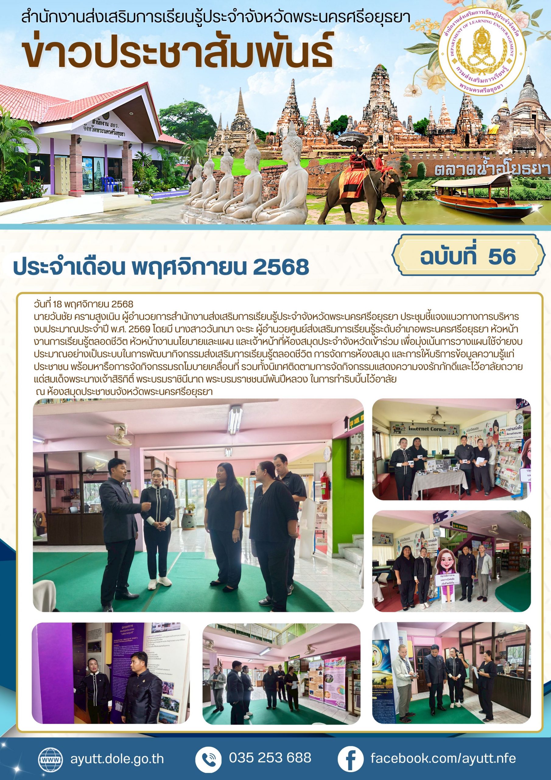 นายวันชัย ครามสูงเนิน ผู้อำนวยการสำนักงานส่งเสริมการเรียนรู้ประจำจังหวัดพระนครศรีอยุธยา ประชุมชี้แจงแนวทางการบริหารงบประมาณประจำปี พ.ศ. 2569 โดยมี นางสาววันทนา จะระ ผู้อำนวยศูนย์ส่งเสริมการเรียนรู้ระดับอำเภอพระนครศรีอยุธยา หัวหน้างานการเรียนรู้ตลอดชีวิต หัวหน้างานนโยบายและแผน และเจ้าหน้าที่ห้องสมุดประจำจังหวัดเข้าร่วม เพื่อมุ่งเน้นการวางแผนใช้จ่ายงบประมาณอย่างเป็นระบบในการพัฒนากิจกรรมส่งเสริมการเรียนรู้ตลอดชีวิต การจัดการห้องสมุด และการให้บริการข้อมูลความรู้แก่ประชาชน พร้อมหารือการจัดกิจกรรมรถโมบายเคลื่อนที่ รวมทั้งนิเทศติดตามการจัดกิจกรรมแสดงความจงรักภักดีและไว้อาลัยถวายแด่สมเด็จพระนางเจ้าสิริกิติ์ พระบรมราชินีนาถ พระบรมราชชนนีพันปีหลวง ในการทำริบบิ้นไว้อาลัย