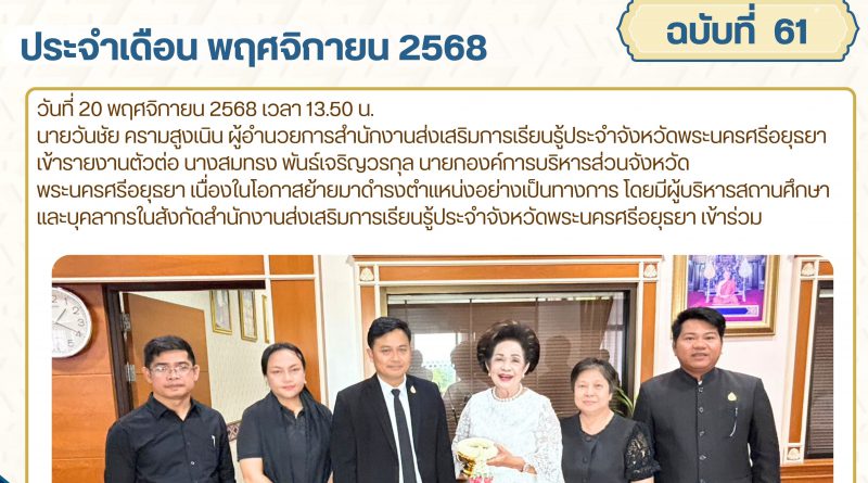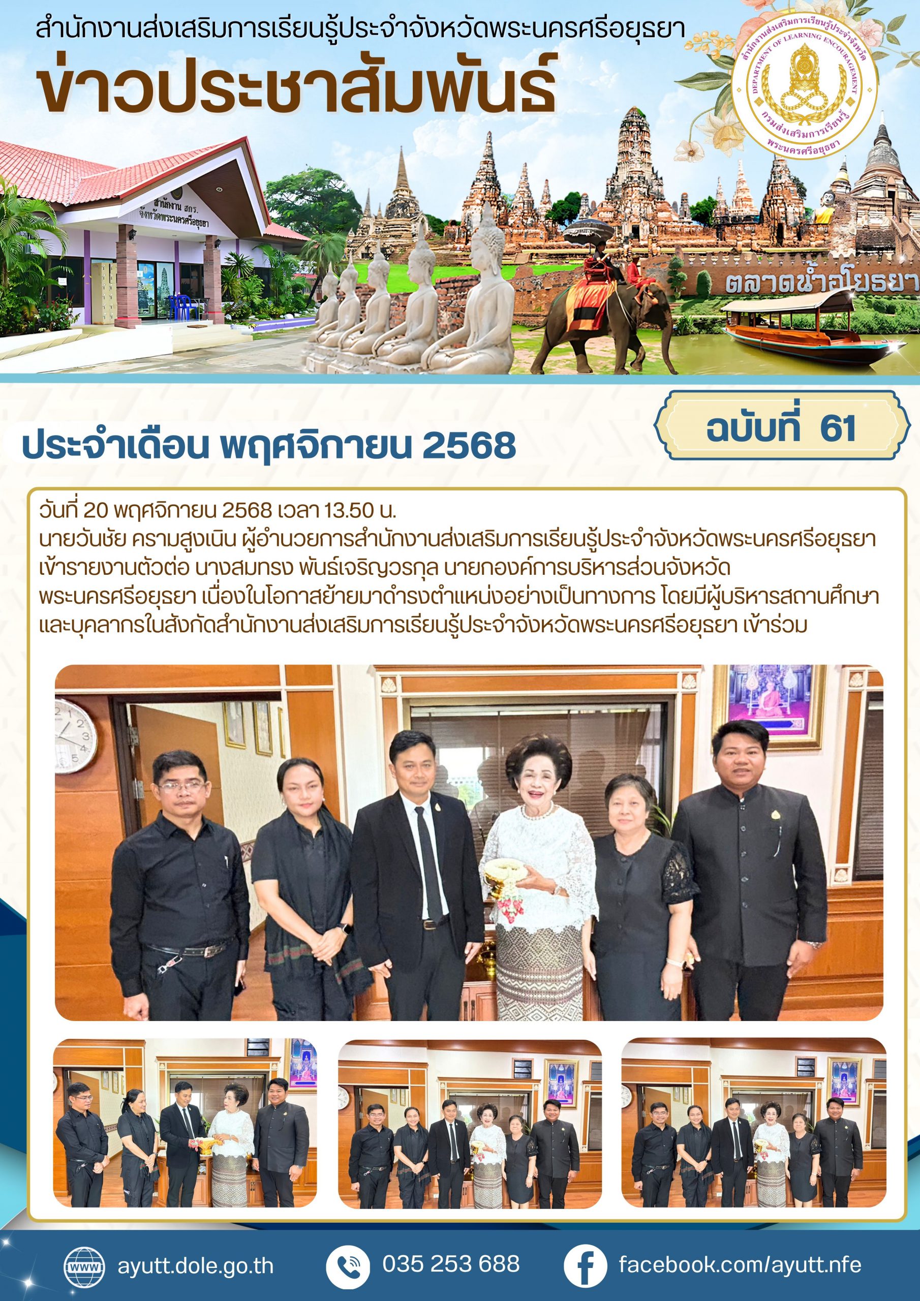 นายวันชัย ครามสูงเนิน ผู้อำนวยการสำนักงานส่งเสริมการเรียนรู้ประจำจังหวัดพระนครศรีอยุธยา เข้ารายงานตัวต่อ นางสมทรง พันธ์เจริญวรกุล นายกองค์การบริหารส่วนจังหวัดพระนครศรีอยุธยา เนื่องในโอกาสย้ายมาดำรงตำแหน่งอย่างเป็นทางการ โดยมีผู้บริหารสถานศึกษา และบุคลากรในสังกัดสำนักงานส่งเสริมการเรียนรู้ประจำจังหวัดพระนครศรีอยุธยา เข้าร่วม