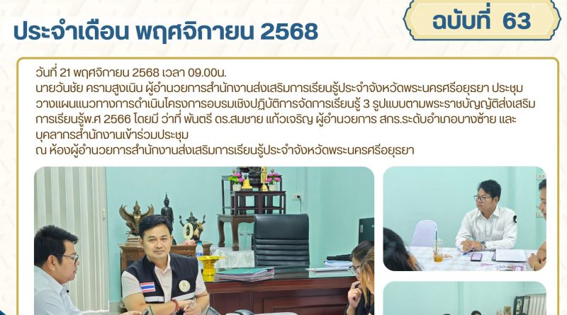 นายวันชัย ครามสูงเนิน ผู้อำนวยการสำนักงานส่งเสริมการเรียนรู้ประจำจังหวัดพระนครศรีอยุธยา ประชุมวางแผนแนวทางการดำเนินโครงการอบรมเชิงปฏิบัติการจัดการเรียนรู้ 3 รูปแบบตามพระราชบัญญัติส่งเสริมการเรียนรู้พ.ศ 2566 โดยมี ว่าที่ พันตรี ดร.สมชาย แก้วเจริญ ผู้อำนวยการ สกร.ระดับอำเภอบางซ้าย และบุคลากรสำนักงานเข้าร่วมประชุม