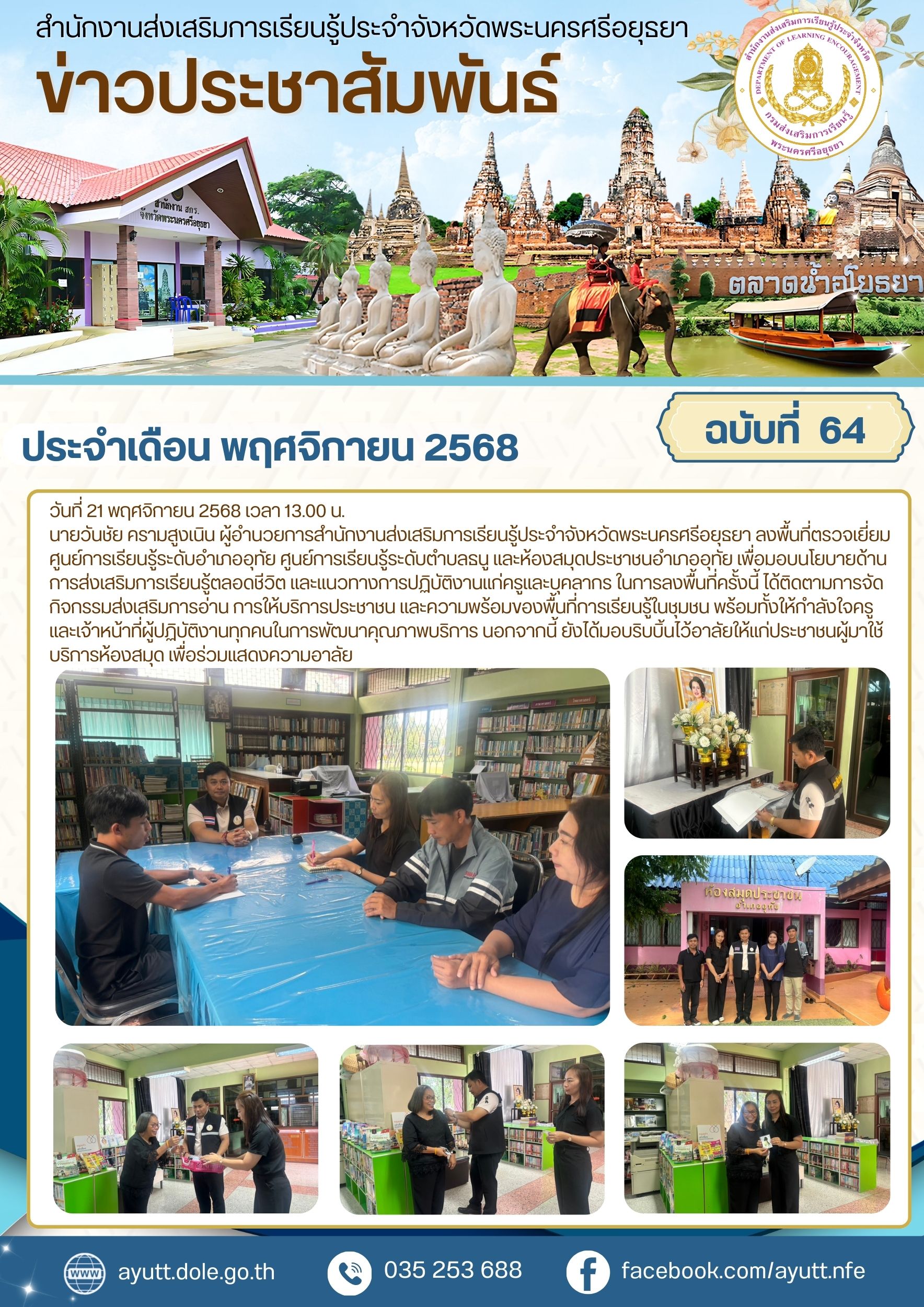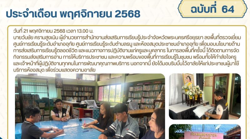 นายวันชัย ครามสูงเนิน ผู้อำนวยการสำนักงานส่งเสริมการเรียนรู้ประจำจังหวัดพระนครศรีอยุธยา ลงพื้นที่ตรวจเยี่ยมศูนย์การเรียนรู้ระดับอำเภออุทัย ศูนย์การเรียนรู้ระดับตำบลธนู และห้องสมุดประชาชนอำเภออุทัย เพื่อมอบนโยบายด้านการส่งเสริมการเรียนรู้ตลอดชีวิต และแนวทางการปฏิบัติงานแก่ครูและบุคลากร ในการลงพื้นที่ครั้งนี้ ได้ติดตามการจัดกิจกรรมส่งเสริมการอ่าน การให้บริการประชาชน และความพร้อมของพื้นที่การเรียนรู้ในชุมชน พร้อมทั้งให้กำลังใจครูและเจ้าหน้าที่ผู้ปฏิบัติงานทุกคนในการพัฒนาคุณภาพบริการ นอกจากนี้ ยังได้มอบริบบิ้นไว้อาลัยให้แก่ประชาชนผู้มาใช้บริการห้องสมุด เพื่อร่วมแสดงความอาลัย