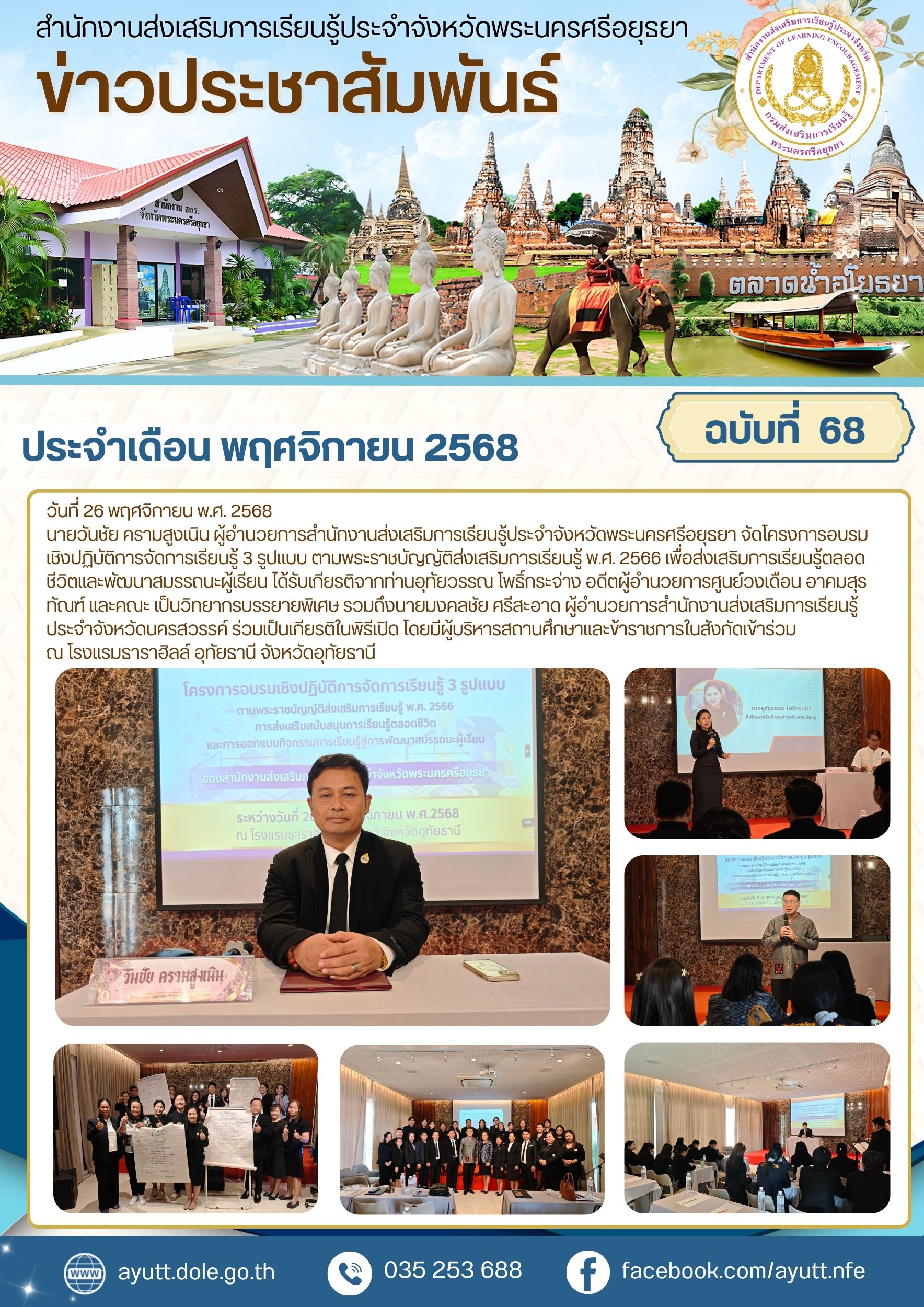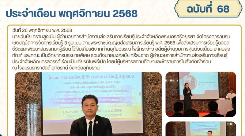 นายวันชัย ครามสูงเนิน ผู้อำนวยการสำนักงานส่งเสริมการเรียนรู้ประจำจังหวัดพระนครศรีอยุธยา จัดโครงการอบรมเชิงปฏิบัติการจัดการเรียนรู้ 3 รูปแบบ ตามพระราชบัญญัติส่งเสริมการเรียนรู้ พ.ศ. 2566 เพื่อส่งเสริมการเรียนรู้ตลอดชีวิตและพัฒนาสมรรถนะผู้เรียน ได้รับเกียรติจากท่านอุทัยวรรณ โพธิ์กระจ่าง อดีตผู้อำนวยการศูนย์วงเดือน อาคมสุรทัณฑ์ และคณะ เป็นวิทยากรบรรยายพิเศษ รวมถึงนายมงคลชัย ศรีสะอาด ผู้อำนวยการสำนักงานส่งเสริมการเรียนรู้ประจำจังหวัดนครสวรรค์ ร่วมเป็นเกียรติในพิธีเปิด โดยมีผู้บริหารสถานศึกษาและข้าราชการในสังกัดเข้าร่วม