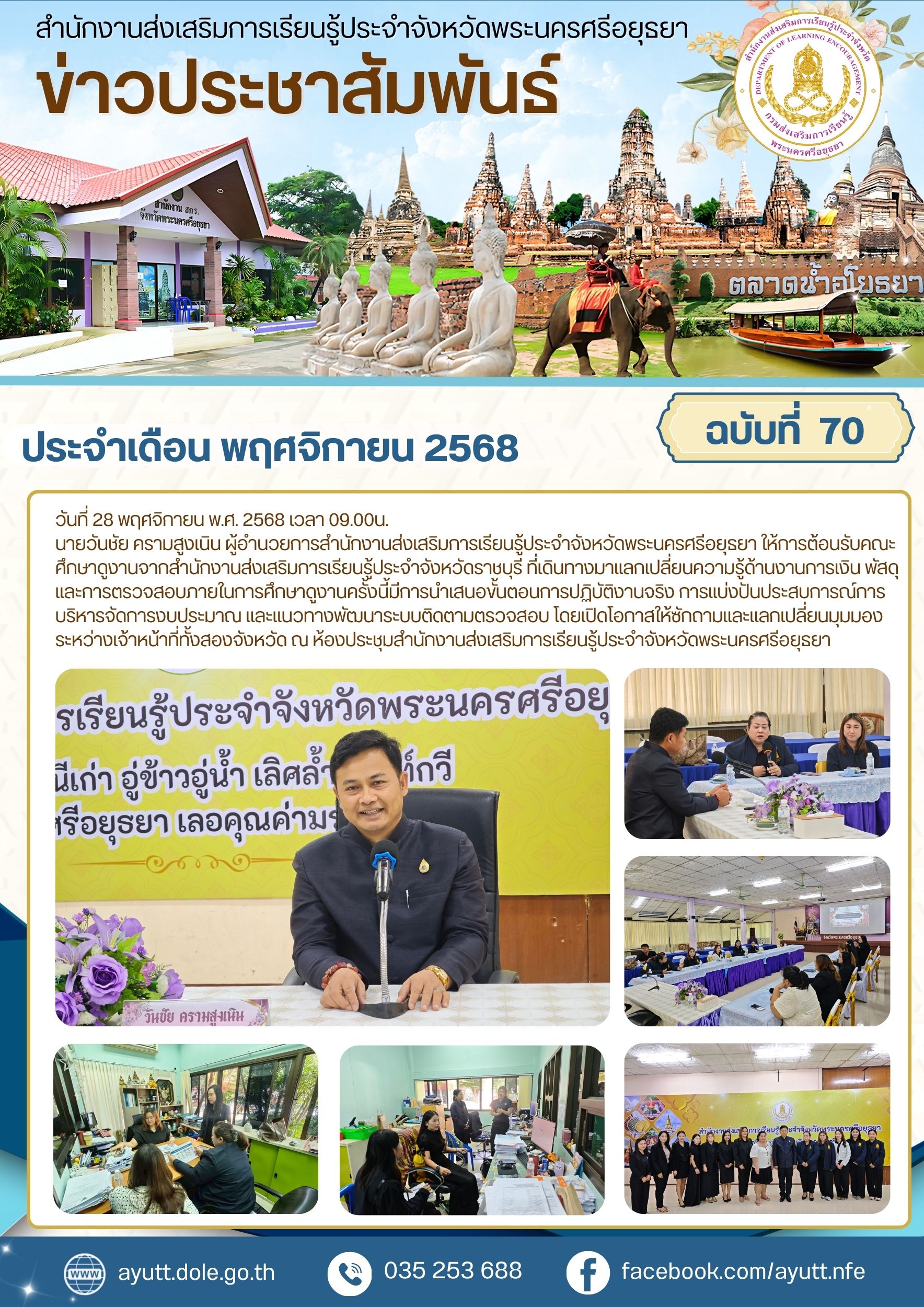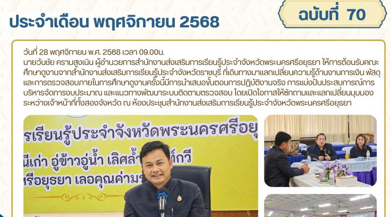 นายวันชัย ครามสูงเนิน ผู้อำนวยการสำนักงานส่งเสริมการเรียนรู้ประจำจังหวัดพระนครศรีอยุธยา ให้การต้อนรับคณะศึกษาดูงานจากสำนักงานส่งเสริมการเรียนรู้ประจำจังหวัดราชบุรี ที่เดินทางมาแลกเปลี่ยนความรู้ด้านงานการเงิน พัสดุ และการตรวจสอบภายในการศึกษาดูงานครั้งนี้มีการนำเสนอขั้นตอนการปฏิบัติงานจริง การแบ่งปันประสบการณ์การบริหารจัดการงบประมาณ และแนวทางพัฒนาระบบติดตามตรวจสอบ โดยเปิดโอกาสให้ซักถามและแลกเปลี่ยนมุมมองระหว่างเจ้าหน้าที่ทั้งสองจังหวัด ณ ห้องประชุมสำนักงานส่งเสริมการเรียนรู้ประจำจังหวัดพระนครศรีอยุธยา