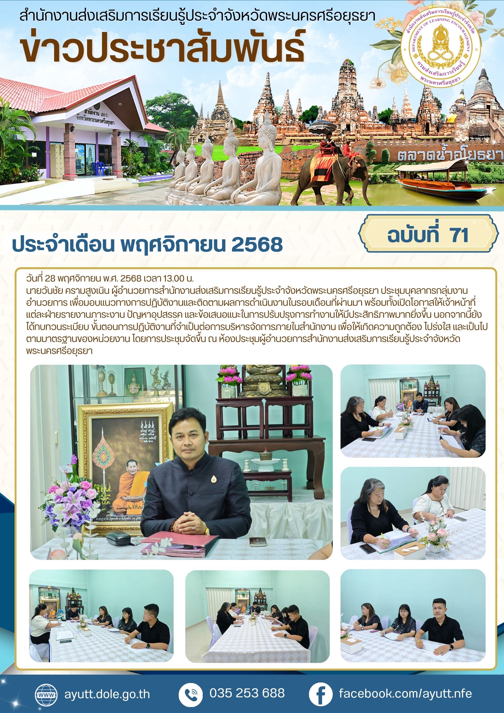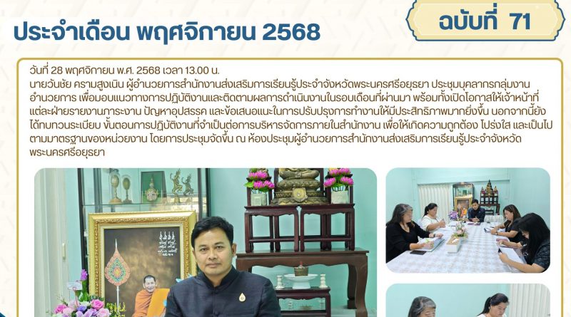 นายวันชัย ครามสูงเนิน ผู้อำนวยการสำนักงานส่งเสริมการเรียนรู้ประจำจังหวัดพระนครศรีอยุธยา ประชุมบุคลากรกลุ่มงานอำนวยการ เพื่อมอบแนวทางการปฏิบัติงานและติดตามผลการดำเนินงานในรอบเดือนที่ผ่านมา พร้อมทั้งเปิดโอกาสให้เจ้าหน้าที่แต่ละฝ่ายรายงานภาระงาน ปัญหาอุปสรรค และข้อเสนอแนะในการปรับปรุงการทำงานให้มีประสิทธิภาพมากยิ่งขึ้น นอกจากนี้ยังได้ทบทวนระเบียบ ขั้นตอนการปฏิบัติงานที่จำเป็นต่อการบริหารจัดการภายในสำนักงาน เพื่อให้เกิดความถูกต้อง โปร่งใส และเป็นไปตามมาตรฐานของหน่วยงาน โดยการประชุมจัดขึ้น ณ ห้องประชุมผู้อำนวยการสำนักงานส่งเสริมการเรียนรู้ประจำจังหวัดพระนครศรีอยุธยา