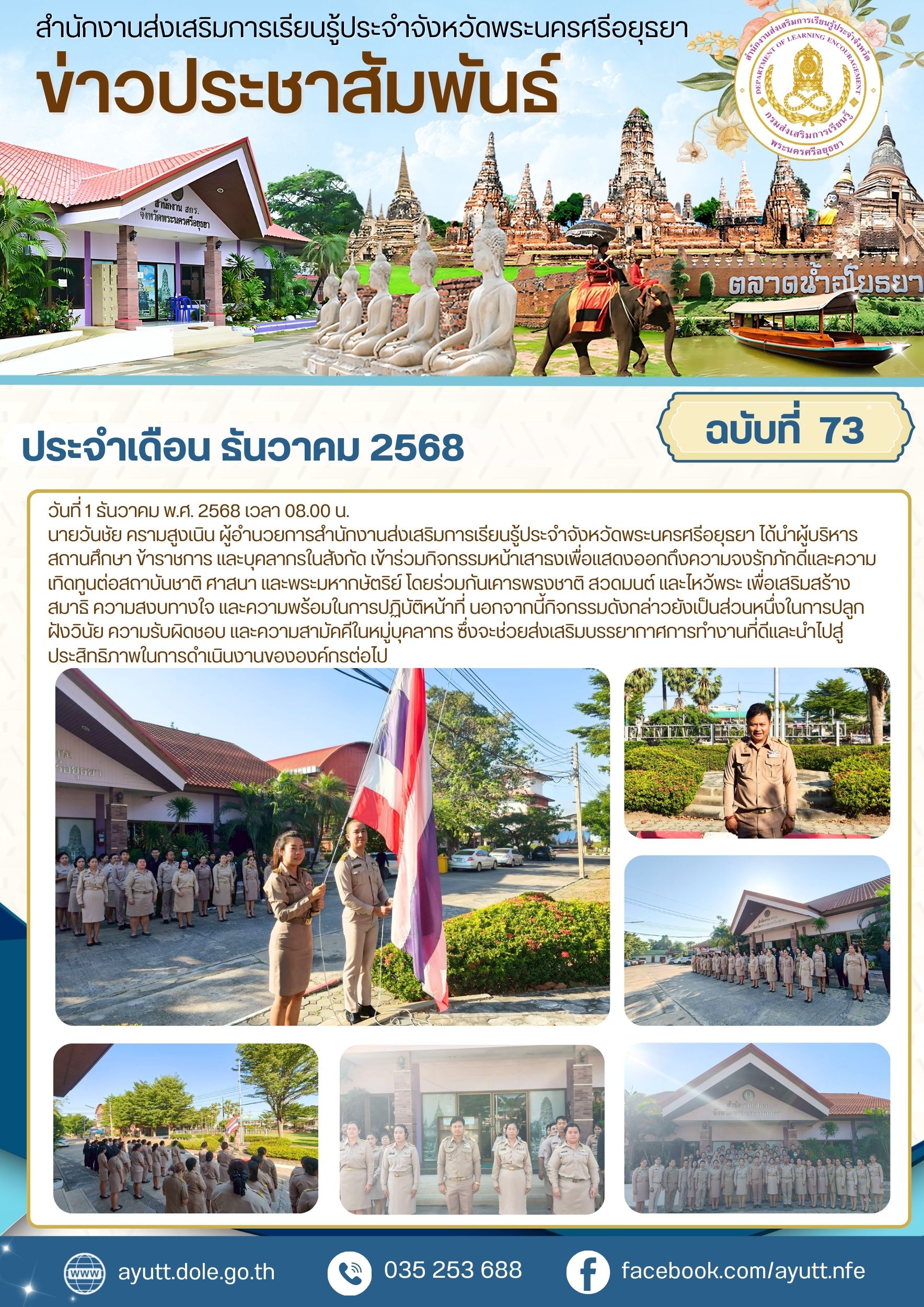 นายวันชัย ครามสูงเนิน ผู้อำนวยการสำนักงานส่งเสริมการเรียนรู้ประจำจังหวัดพระนครศรีอยุธยา ได้นำผู้บริหารสถานศึกษา ข้าราชการ และบุคลากรในสังกัด เข้าร่วมกิจกรรมหน้าเสาธงเพื่อแสดงออกถึงความจงรักภักดีและความเทิดทูนต่อสถาบันชาติ ศาสนา และพระมหากษัตริย์ โดยร่วมกันเคารพธงชาติ สวดมนต์ และไหว้พระ เพื่อเสริมสร้างสมาธิ ความสงบทางใจ และความพร้อมในการปฏิบัติหน้าที่ นอกจากนี้กิจกรรมดังกล่าวยังเป็นส่วนหนึ่งในการปลูกฝังวินัย ความรับผิดชอบ และความสามัคคีในหมู่บุคลากร ซึ่งจะช่วยส่งเสริมบรรยากาศการทำงานที่ดีและนำไปสู่ประสิทธิภาพในการดำเนินงานขององค์กรต่อไป