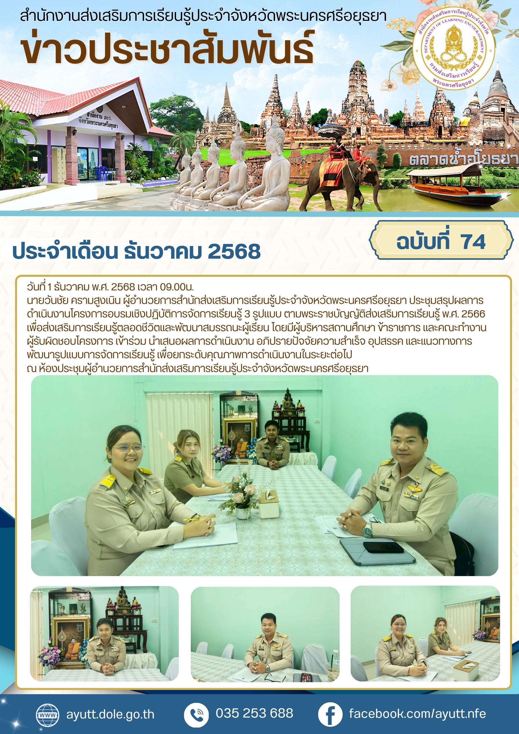 นายวันชัย ครามสูงเนิน ผู้อำนวยการสำนักส่งเสริมการเรียนรู้ประจำจังหวัดพระนครศรีอยุธยา ประชุมสรุปผลการดำเนินงานโครงการอบรมเชิงปฏิบัติการจัดการเรียนรู้ 3 รูปแบบ ตามพระราชบัญญัติส่งเสริมการเรียนรู้ พ.ศ. 2566 เพื่อส่งเสริมการเรียนรู้ตลอดชีวิตและพัฒนาสมรรถนะผู้เรียน โดยมีผู้บริหารสถานศึกษา ข้าราชการ และคณะทำงานผู้รับผิดชอบโครงการ เข้าร่วม นำเสนอผลการดำเนินงาน อภิปรายปัจจัยความสำเร็จ อุปสรรค และแนวทางการพัฒนารูปแบบการจัดการเรียนรู้ เพื่อยกระดับคุณภาพการดำเนินงานในระยะต่อไป