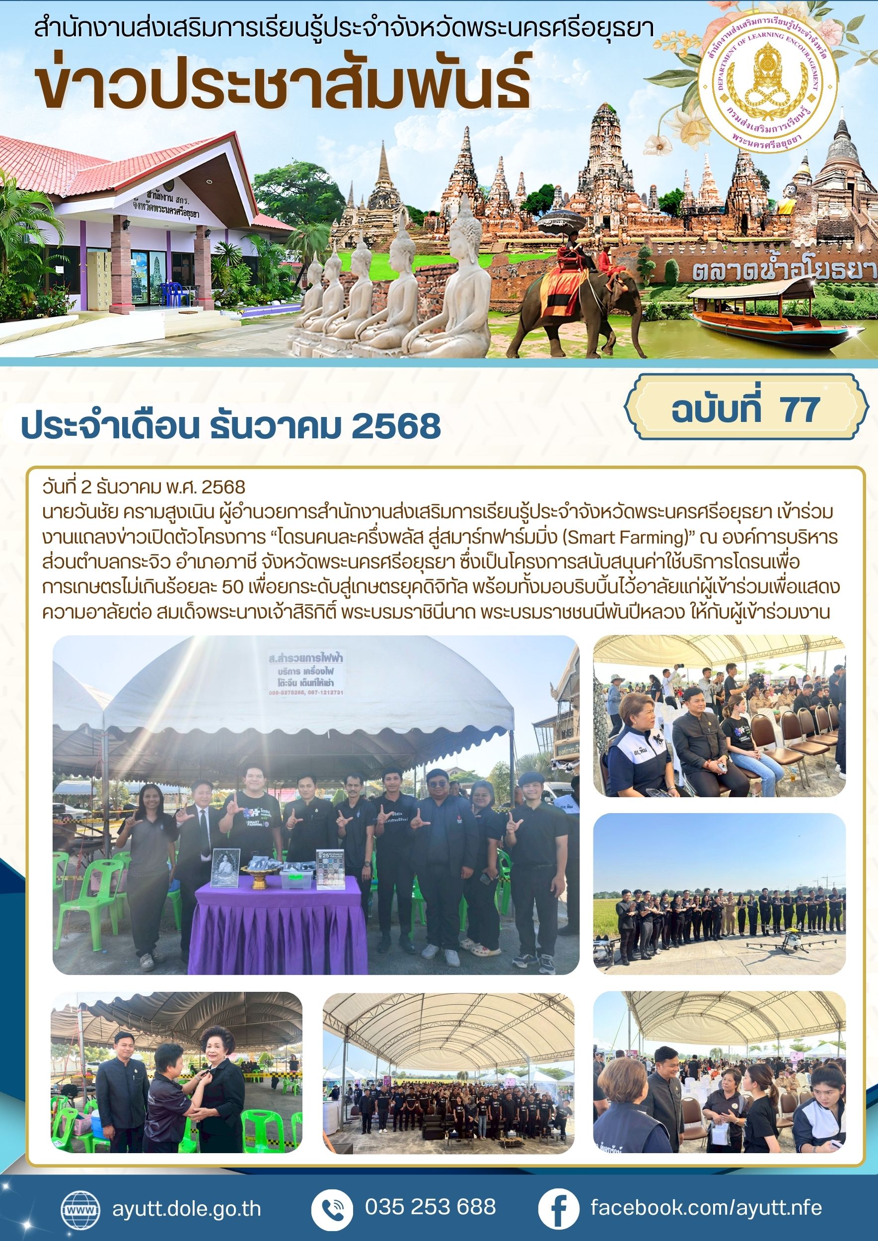 นายวันชัย ครามสูงเนิน ผู้อำนวยการสำนักงานส่งเสริมการเรียนรู้ประจำจังหวัดพระนครศรีอยุธยา เข้าร่วมงานแถลงข่าวเปิดตัวโครงการ “โดรนคนละครึ่งพลัส สู่สมาร์ทฟาร์มมิ่ง (Smart Farming)” ณ องค์การบริหารส่วนตำบลกระจิว อำเภอภาชี จังหวัดพระนครศรีอยุธยา ซึ่งเป็นโครงการสนับสนุนค่าใช้บริการโดรนเพื่อการเกษตรไม่เกินร้อยละ 50 เพื่อยกระดับสู่เกษตรยุคดิจิทัล พร้อมทั้งมอบริบบิ้นไว้อาลัยแก่ผู้เข้าร่วมเพื่อแสดงความอาลัยต่อ สมเด็จพระนางเจ้าสิริกิติ์ พระบรมราชินีนาถ พระบรมราชชนนีพันปีหลวง ให้กับผู้เข้าร่วมงาน