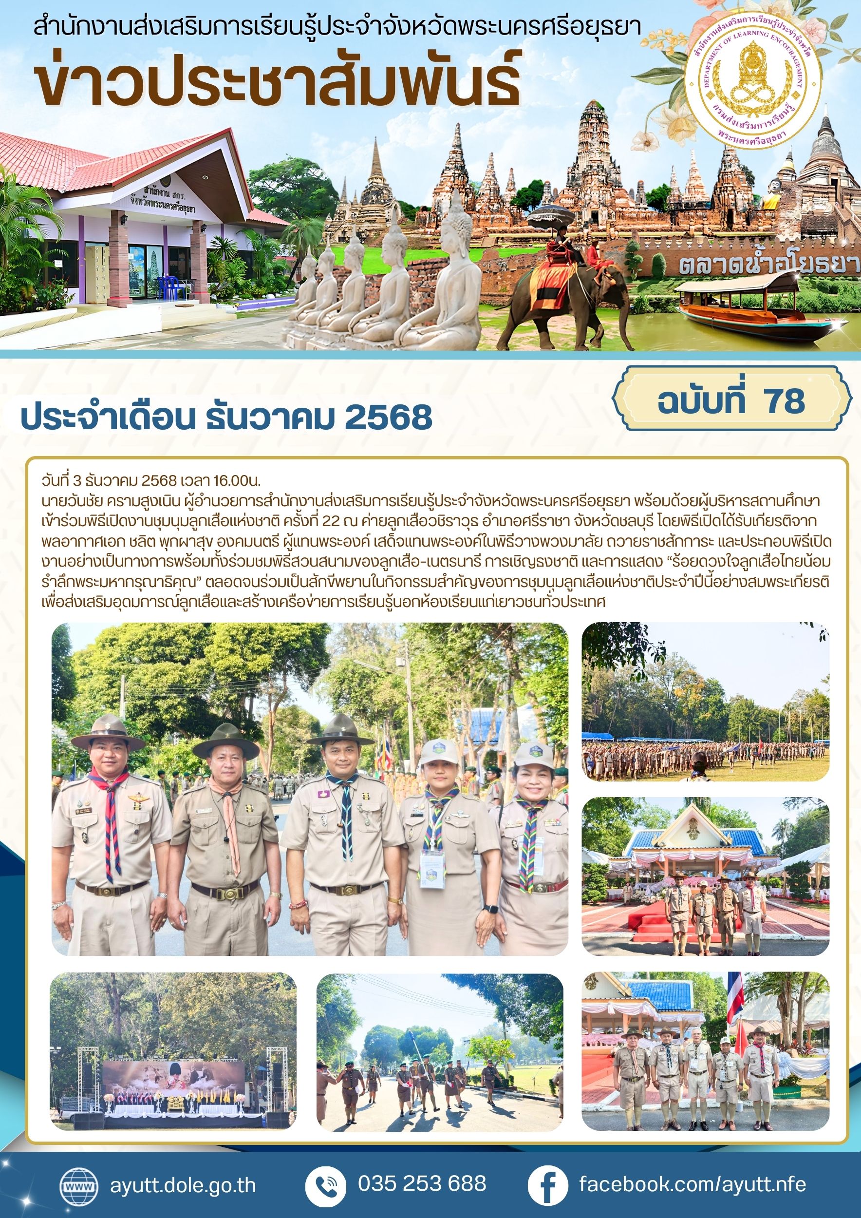 นายวันชัย ครามสูงเนิน ผู้อำนวยการสำนักงานส่งเสริมการเรียนรู้ประจำจังหวัดพระนครศรีอยุธยา พร้อมด้วยผู้บริหารสถานศึกษา เข้าร่วมพิธีเปิดงานชุมนุมลูกเสือแห่งชาติ ครั้งที่ 22 ณ ค่ายลูกเสือวชิราวุธ อำเภอศรีราชา จังหวัดชลบุรี โดยพิธีเปิดได้รับเกียรติจาก พลอากาศเอก ชลิต พุกผาสุข องคมนตรี ผู้แทนพระองค์ เสด็จแทนพระองค์ในพิธีวางพวงมาลัย ถวายราชสักการะ และประกอบพิธีเปิดงานอย่างเป็นทางการพร้อมทั้งร่วมชมพิธีสวนสนามของลูกเสือ–เนตรนารี การเชิญธงชาติ และการแสดง “ร้อยดวงใจลูกเสือไทยน้อมรำลึกพระมหากรุณาธิคุณ” ตลอดจนร่วมเป็นสักขีพยานในกิจกรรมสำคัญของการชุมนุมลูกเสือแห่งชาติประจำปีนี้อย่างสมพระเกียรติ เพื่อส่งเสริมอุดมการณ์ลูกเสือและสร้างเครือข่ายการเรียนรู้นอกห้องเรียนแก่เยาวชนทั่วประเทศ