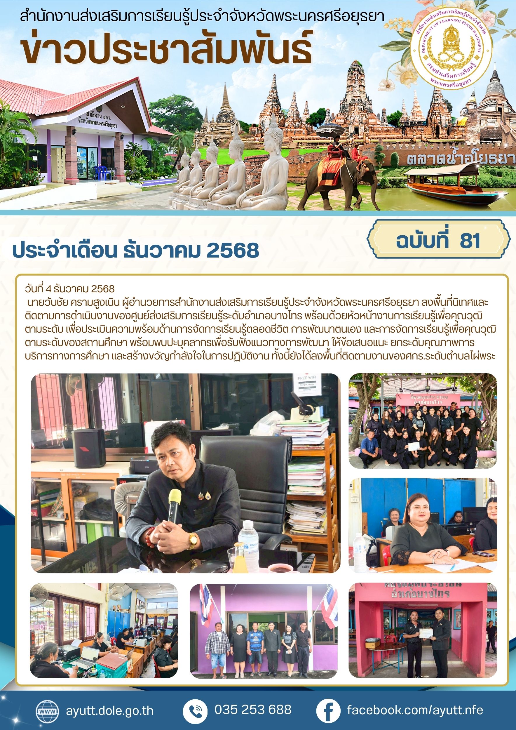 นายวันชัย ครามสูงเนิน ผู้อำนวยการสำนักงานส่งเสริมการเรียนรู้ประจำจังหวัดพระนครศรีอยุธยา ลงพื้นที่นิเทศและติดตามการดำเนินงานของศูนย์ส่งเสริมการเรียนรู้ระดับอำเภอบางไทร พร้อมด้วยหัวหน้างานการเรียนรู้เพื่อคุณวุฒิตามระดับ เพื่อประเมินความพร้อมด้านการจัดการเรียนรู้ตลอดชีวิต การพัฒนาตนเอง และการจัดการเรียนรู้เพื่อคุณวุฒิตามระดับของสถานศึกษา พร้อมพบปะบุคลากรเพื่อรับฟังแนวทางการพัฒนา ให้ข้อเสนอแนะ ยกระดับคุณภาพการบริการทางการศึกษา และสร้างขวัญกำลังใจในการปฏิบัติงาน ทั้งนี้ยังได้ลงพื้นที่ติดตามงานของศกร.ระดับตำบลไผ่พระ