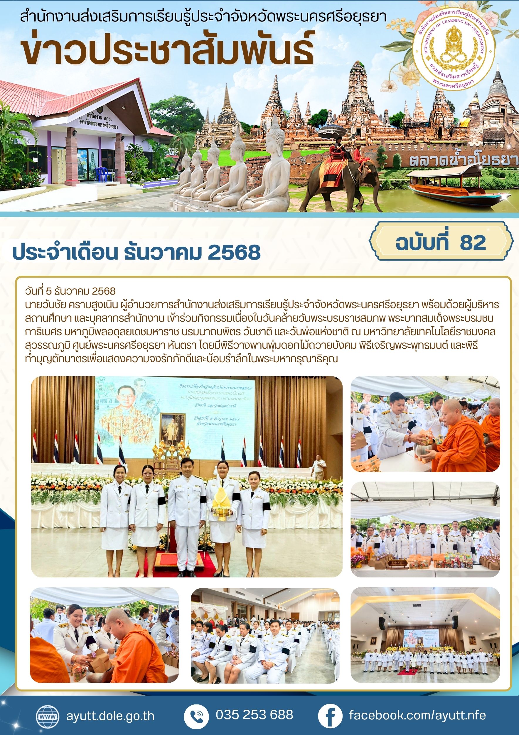 นายวันชัย ครามสูงเนิน ผู้อำนวยการสำนักงานส่งเสริมการเรียนรู้ประจำจังหวัดพระนครศรีอยุธยา พร้อมด้วยผู้บริหารสถานศึกษา และบุคลากรสำนักงาน เข้าร่วมกิจกรรมเนื่องในวันคล้ายวันพระบรมราชสมภพ พระบาทสมเด็จพระบรมชนกาธิเบศร มหาภูมิพลอดุลยเดชมหาราช บรมนาถบพิตร วันชาติ และวันพ่อแห่งชาติ ณ มหาวิทยาลัยเทคโนโลยีราชมงคลสุวรรณภูมิ ศูนย์พระนครศรีอยุธยา หันตรา โดยมีพิธีวางพานพุ่มดอกไม้ถวายบังคม พิธีเจริญพระพุทธมนต์ และพิธีทำบุญตักบาตรเพื่อแสดงความจงรักภักดีและน้อมรำลึกในพระมหากรุณาธิคุณ
