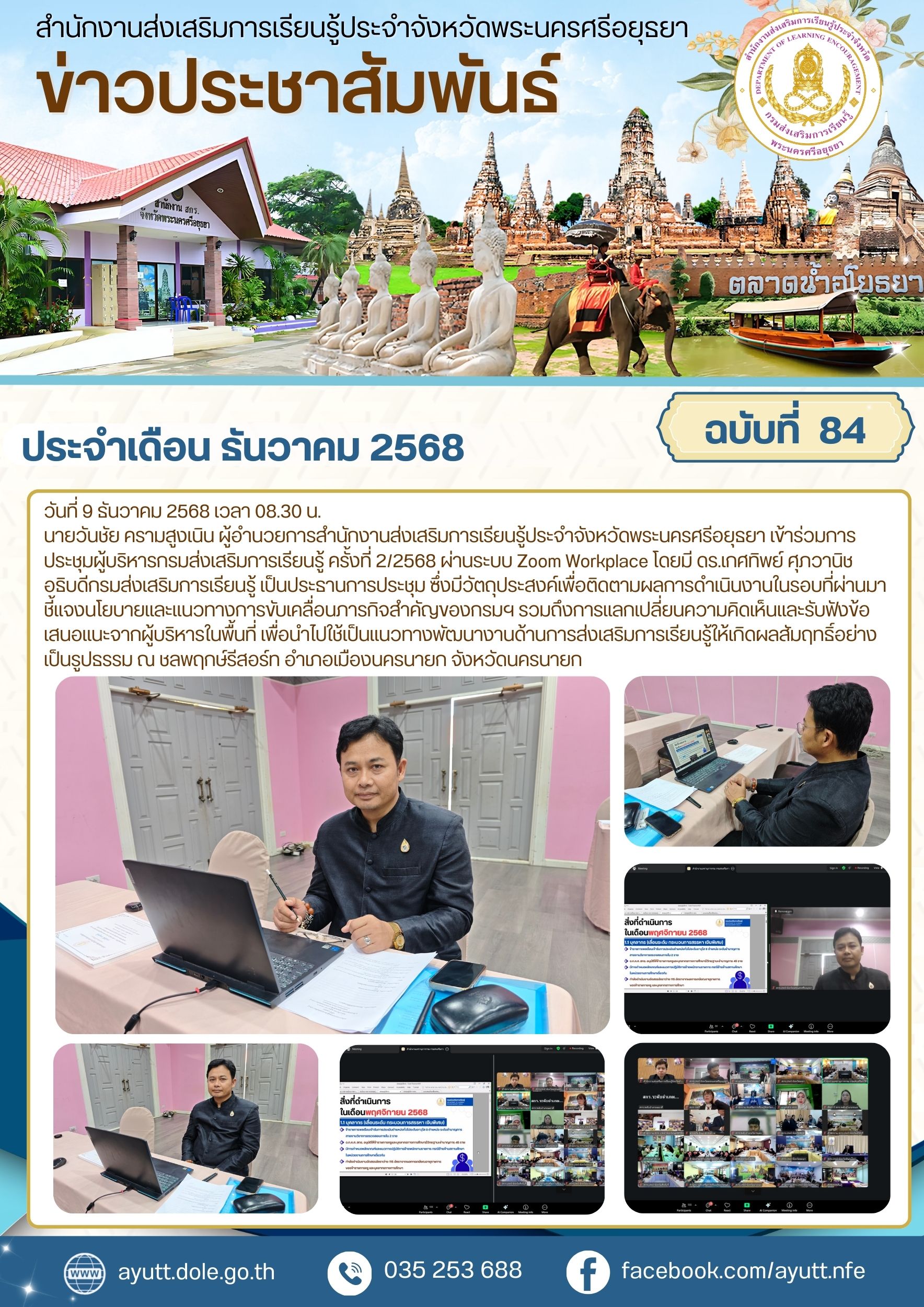 นายวันชัย ครามสูงเนิน ผู้อำนวยการสำนักงานส่งเสริมการเรียนรู้ประจำจังหวัดพระนครศรีอยุธยา เข้าร่วมการประชุมผู้บริหารกรมส่งเสริมการเรียนรู้ ครั้งที่ 2/2568 ผ่านระบบ Zoom Workplace โดยมี ดร.เกศทิพย์ ศุภวานิช อธิบดีกรมส่งเสริมการเรียนรู้ เป็นประธานการประชุม ซึ่งมีวัตถุประสงค์เพื่อติดตามผลการดำเนินงานในรอบที่ผ่านมา ชี้แจงนโยบายและแนวทางการขับเคลื่อนภารกิจสำคัญของกรมฯ รวมถึงการแลกเปลี่ยนความคิดเห็นและรับฟังข้อเสนอแนะจากผู้บริหารในพื้นที่ เพื่อนำไปใช้เป็นแนวทางพัฒนางานด้านการส่งเสริมการเรียนรู้ให้เกิดผลสัมฤทธิ์อย่างเป็นรูปธรรม ณ ชลพฤกษ์รีสอร์ท อำเภอเมืองนครนายก จังหวัดนครนายก